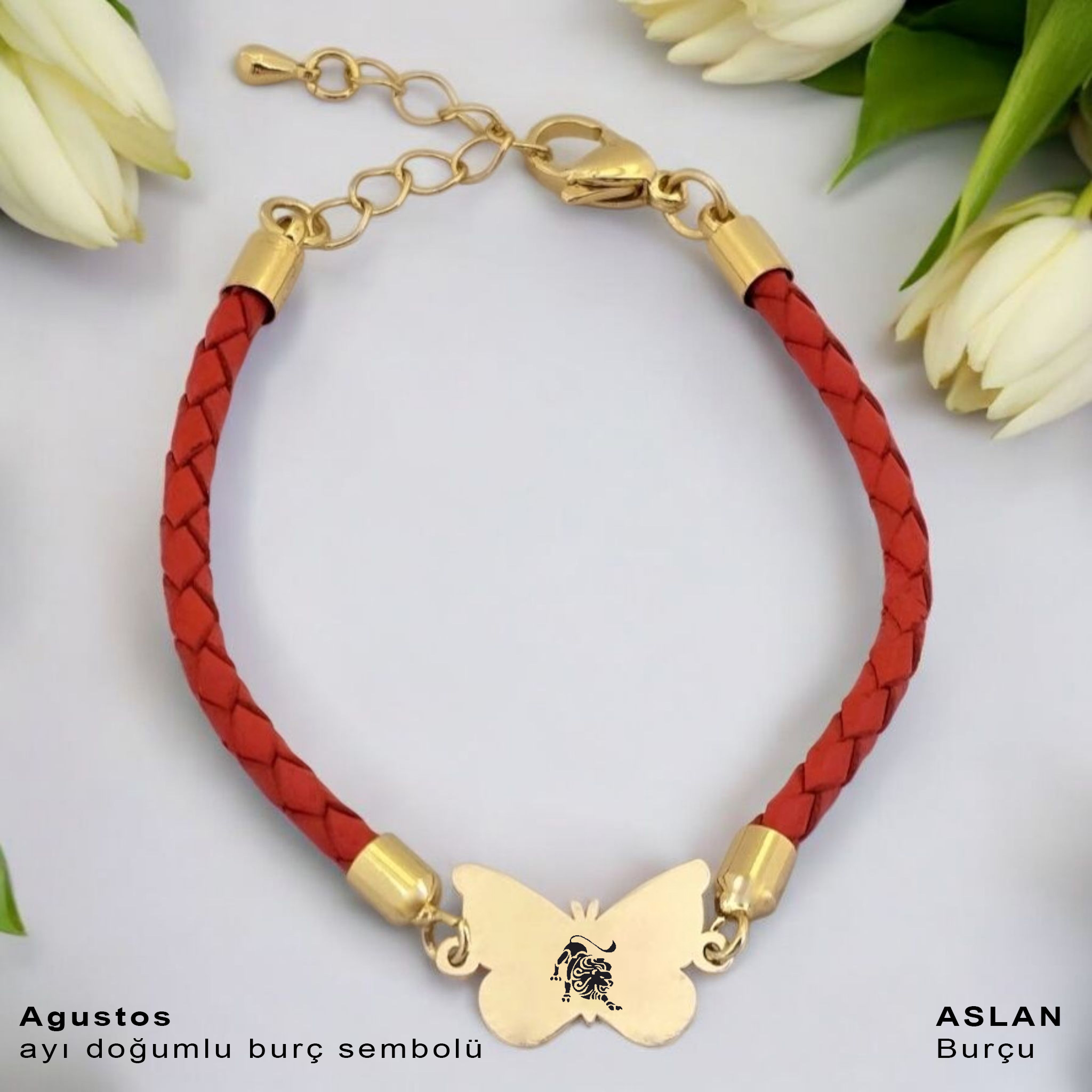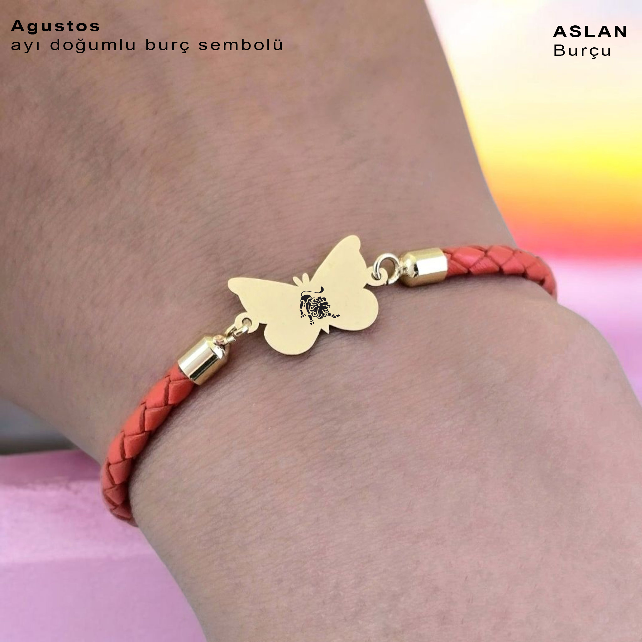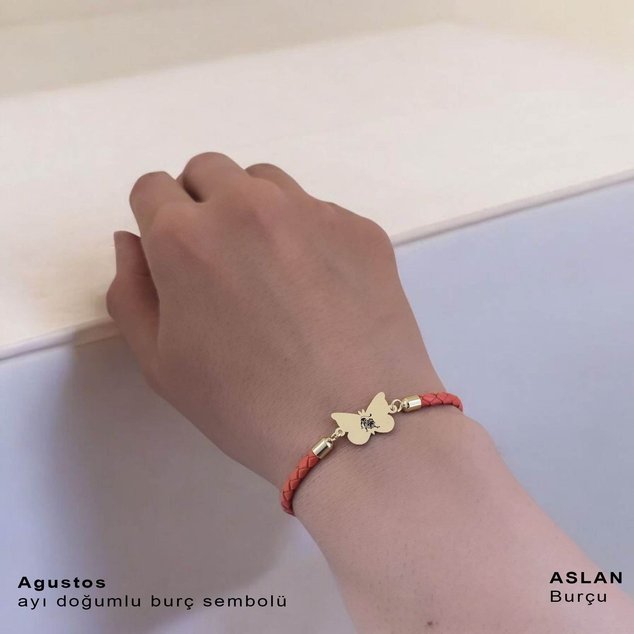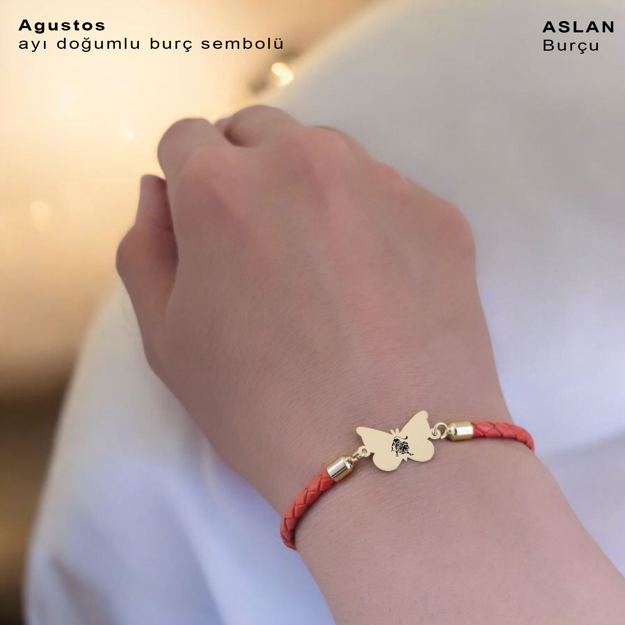 “14 Ayar Altın Plakalı Burca Özel Kelebek Figürlü Doğal Turuncu Derili Hediye Bileklik-502” için yorum yapan ilk kişi siz olun
