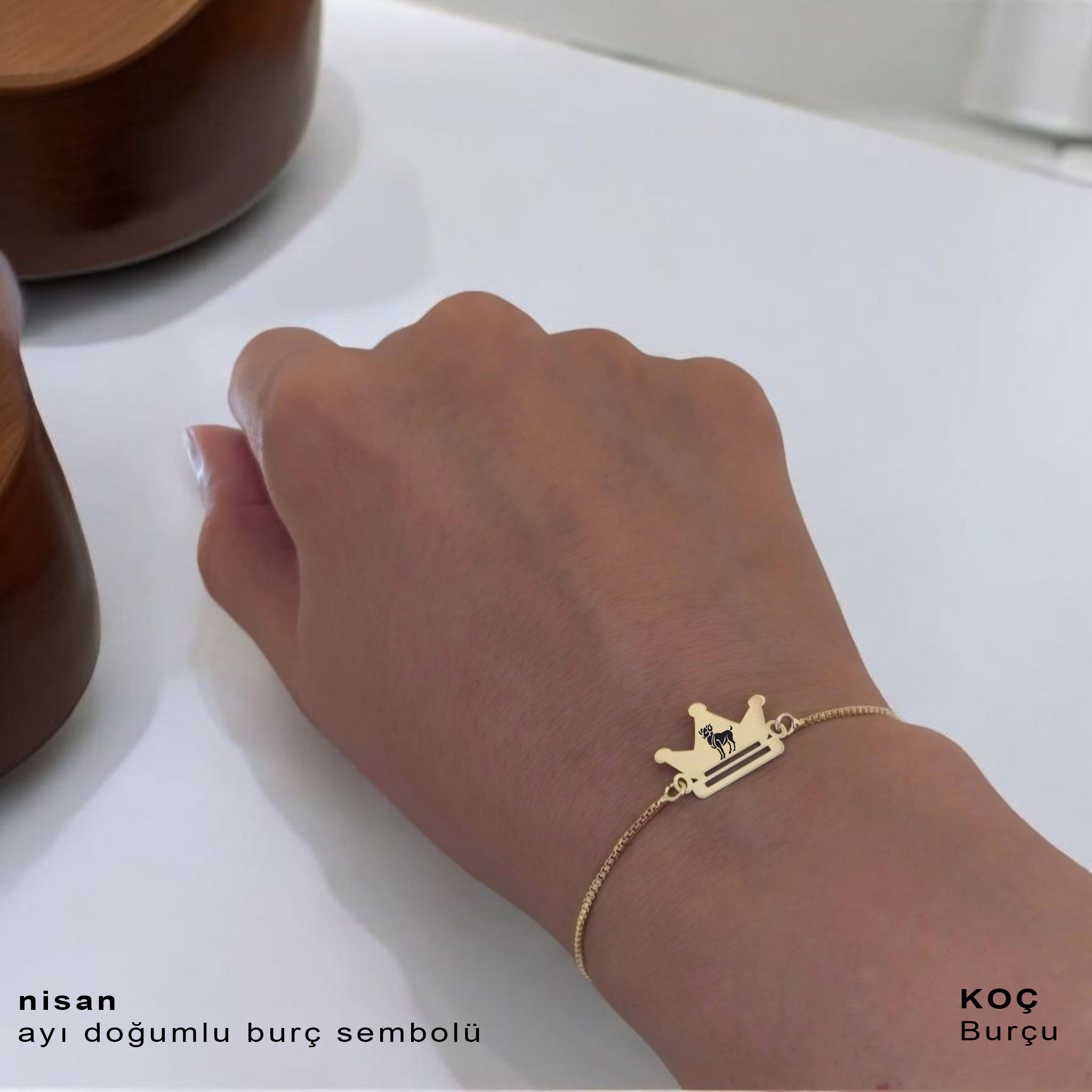 14 Ayar Altın Plakalı Burca Özel Taç Motifli Altın Renkli Zincirli Hediye Bileklik-492