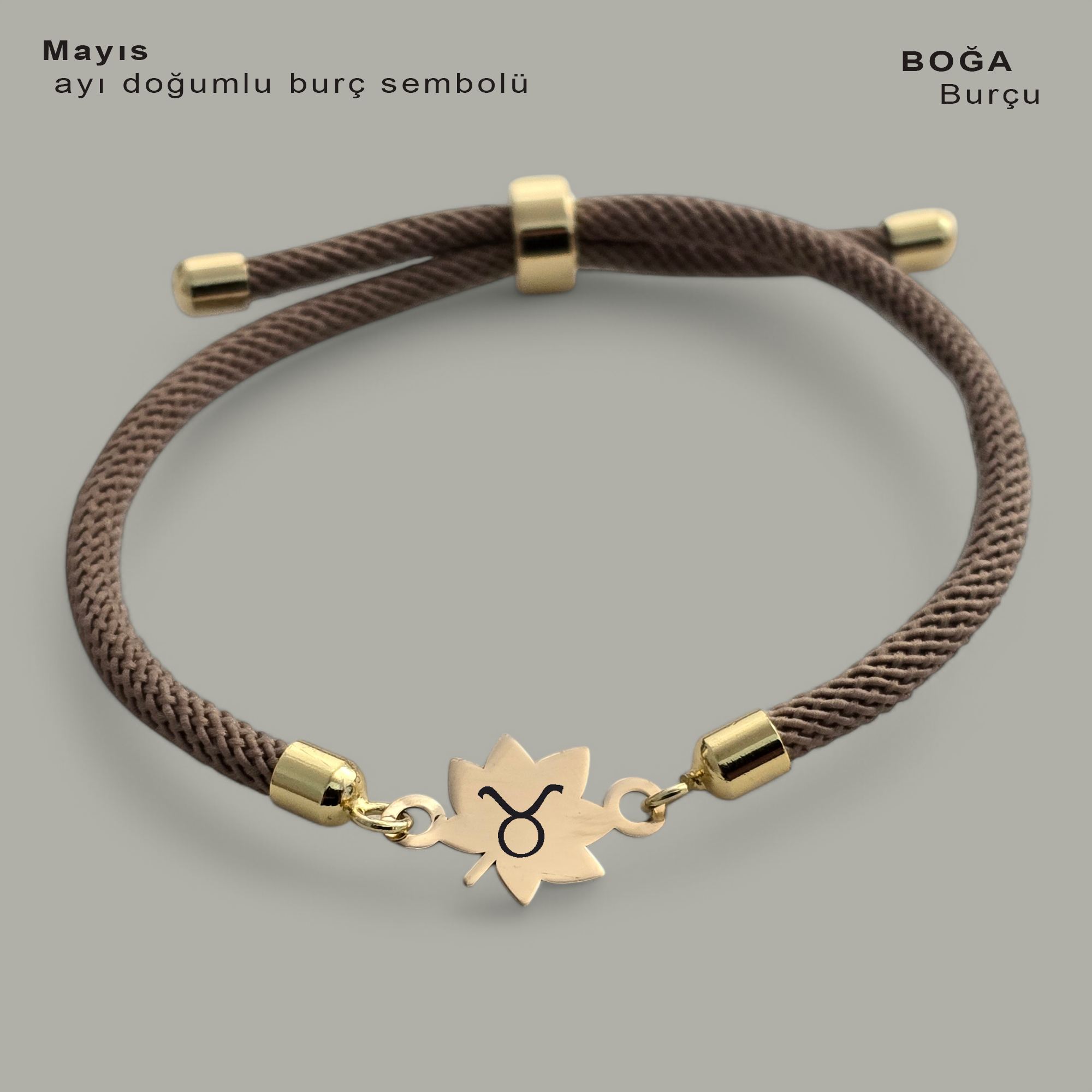 14 Ayar Altın Plakalı Doğum Ayına Özel Kahverengi İpek Örgülü Yaprak Figürlü Hediye Bileklik-331
