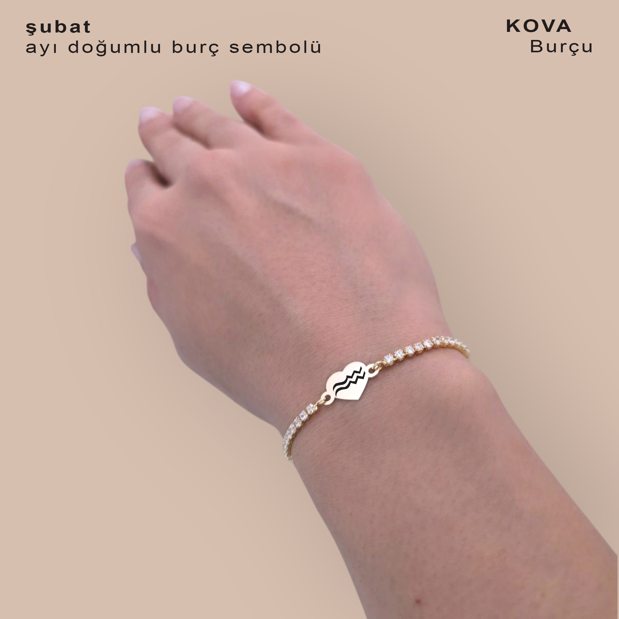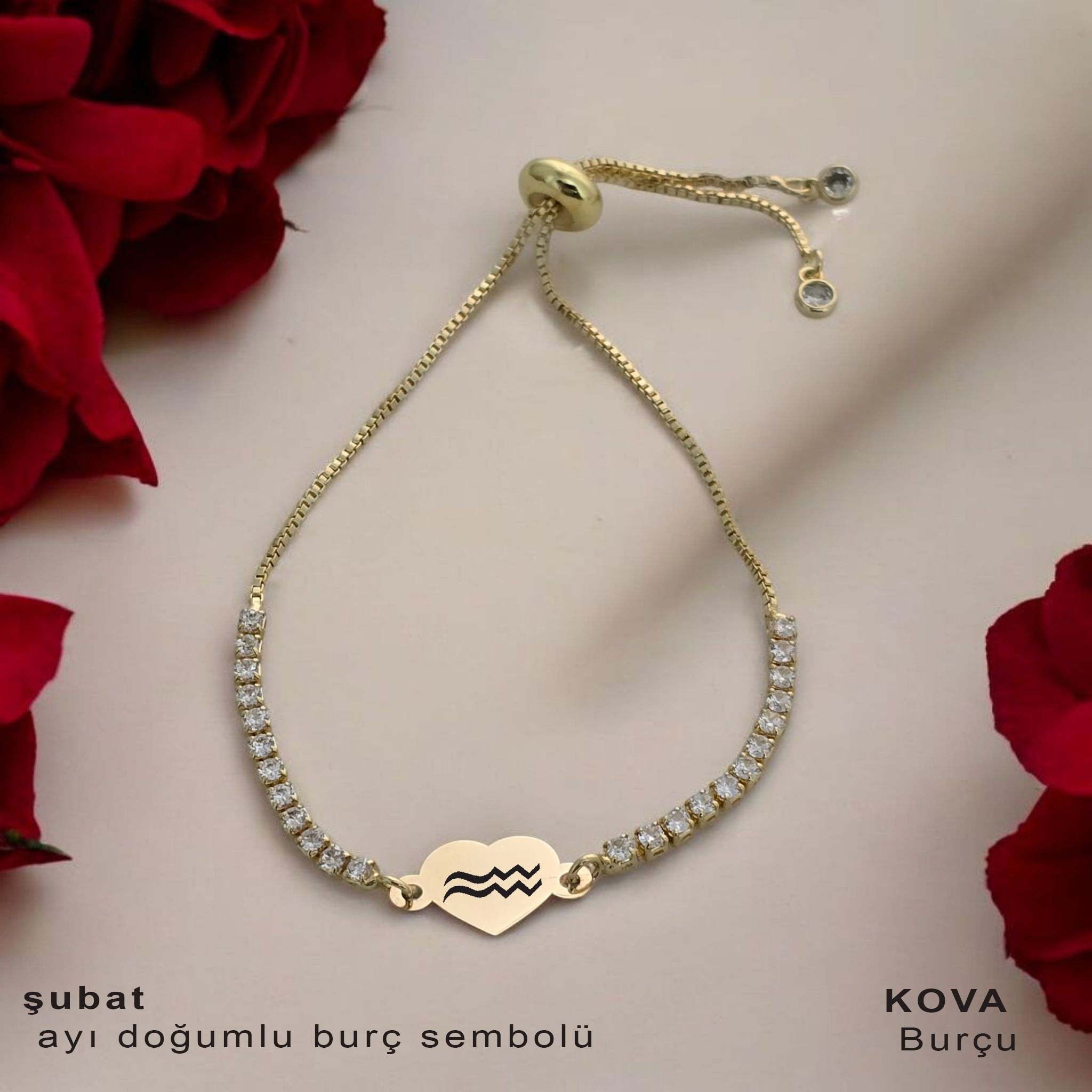 14 Ayar Altın Plakalı Doğum Ayına Özel Zincirli Beyaz Taş Desenli Kalp Figürlü Hediye Bileklik-350