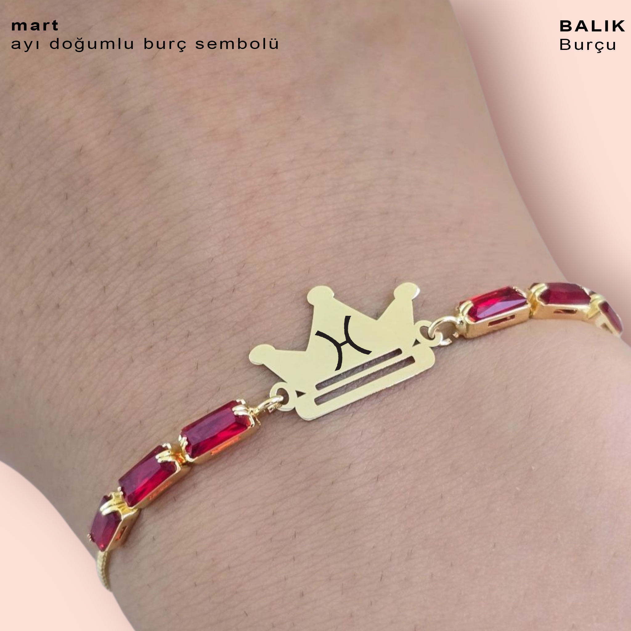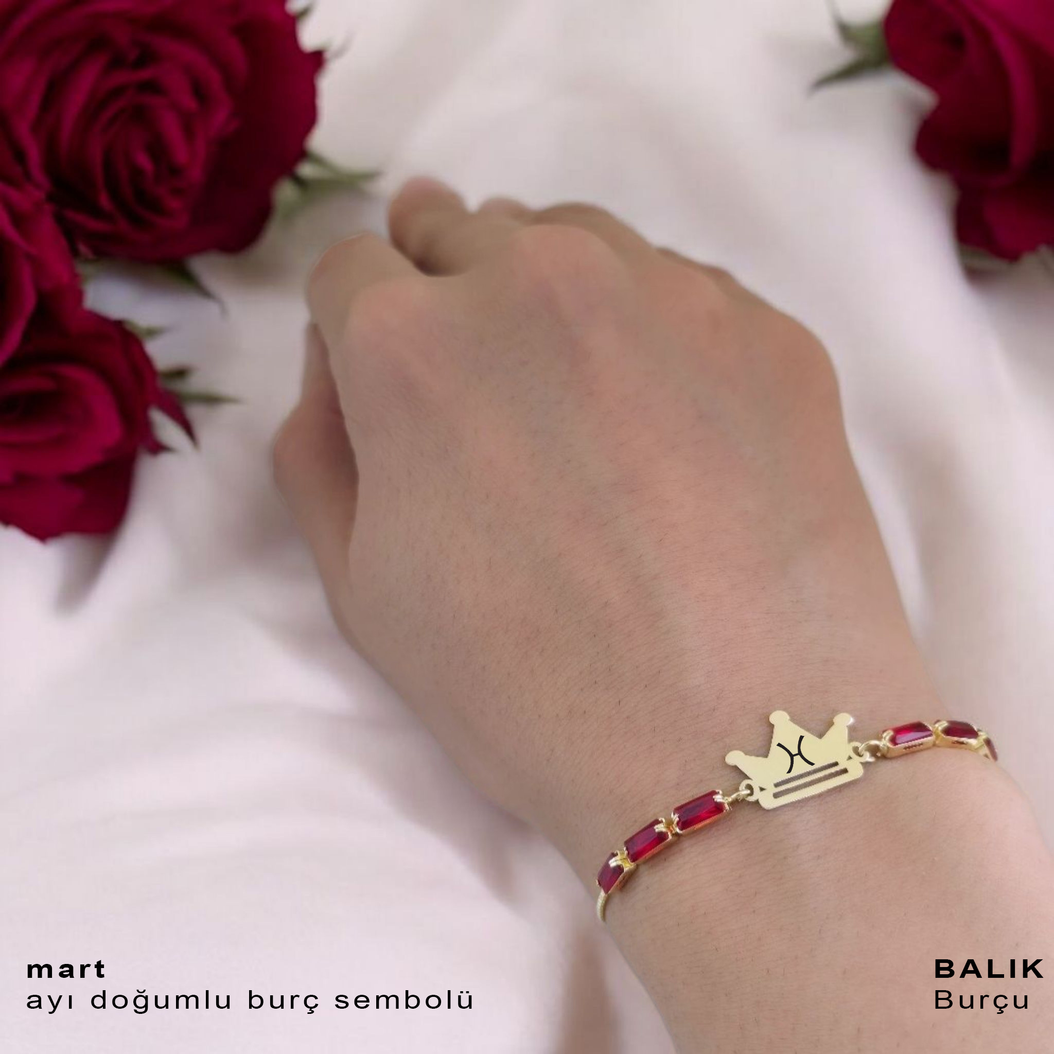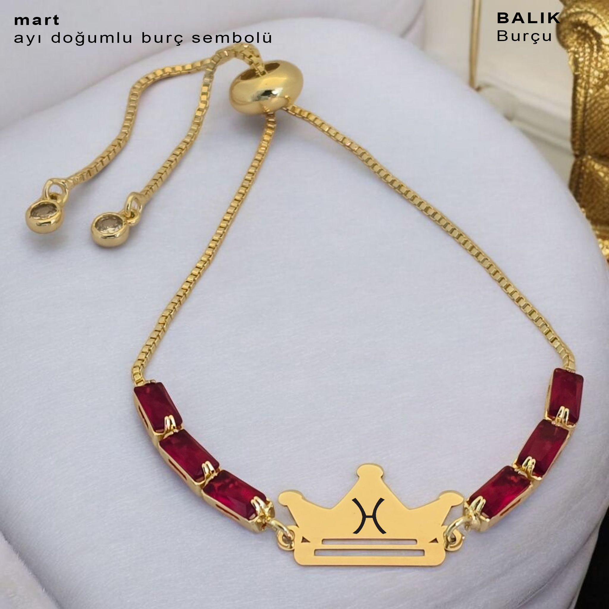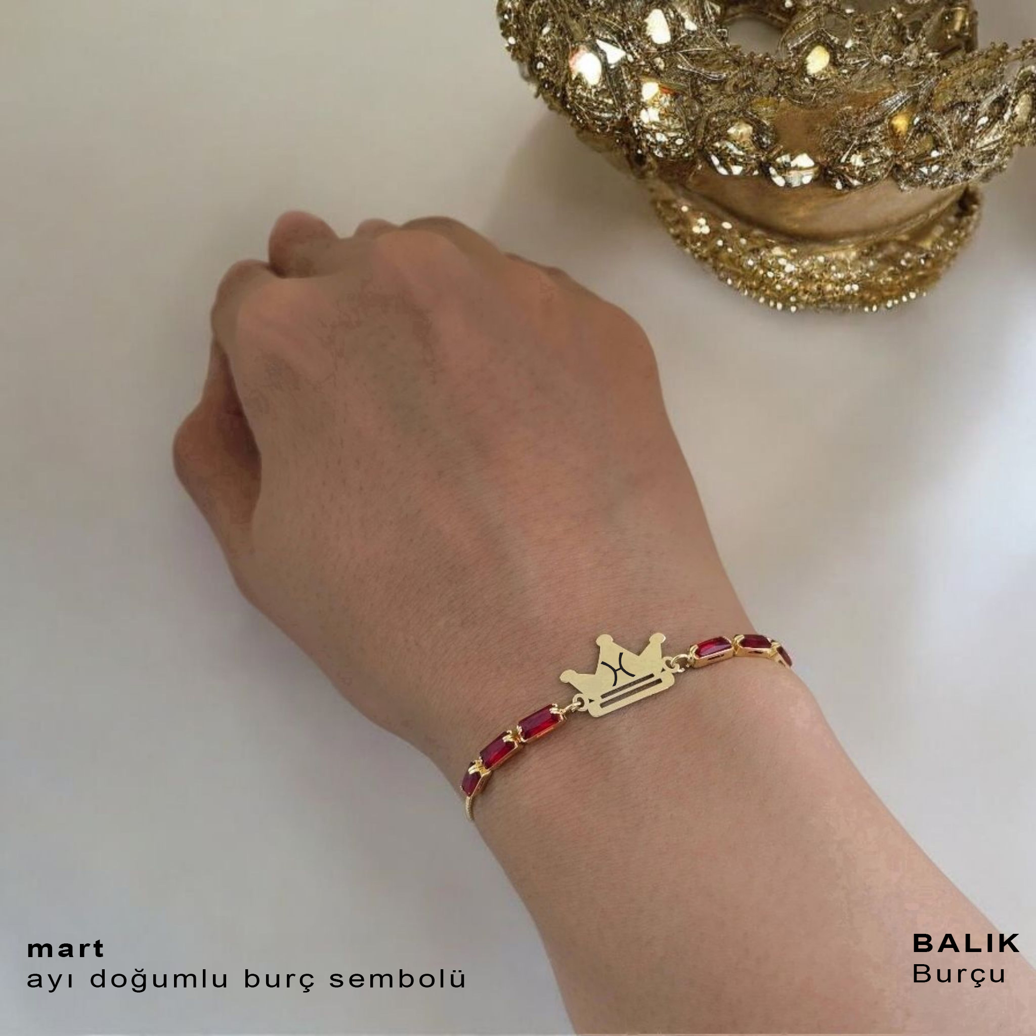 14 Ayar Altın Plakalı Doğum Ayına Özel Zincirli Kırmızı Taş Desenli Taç Figürlü Hediye Bileklik-496