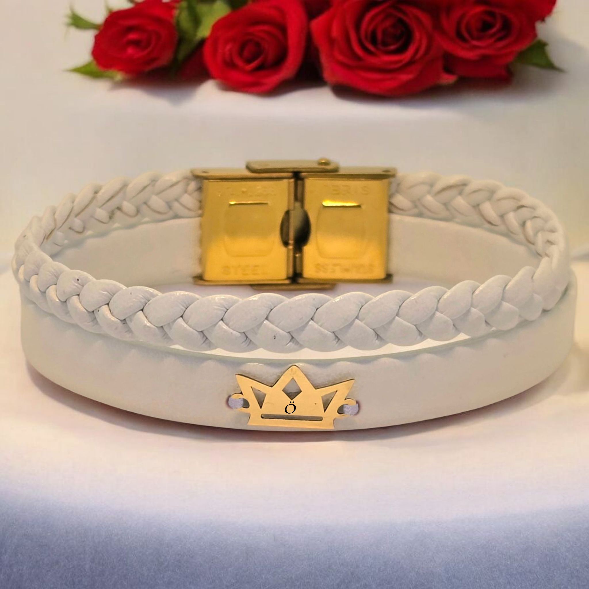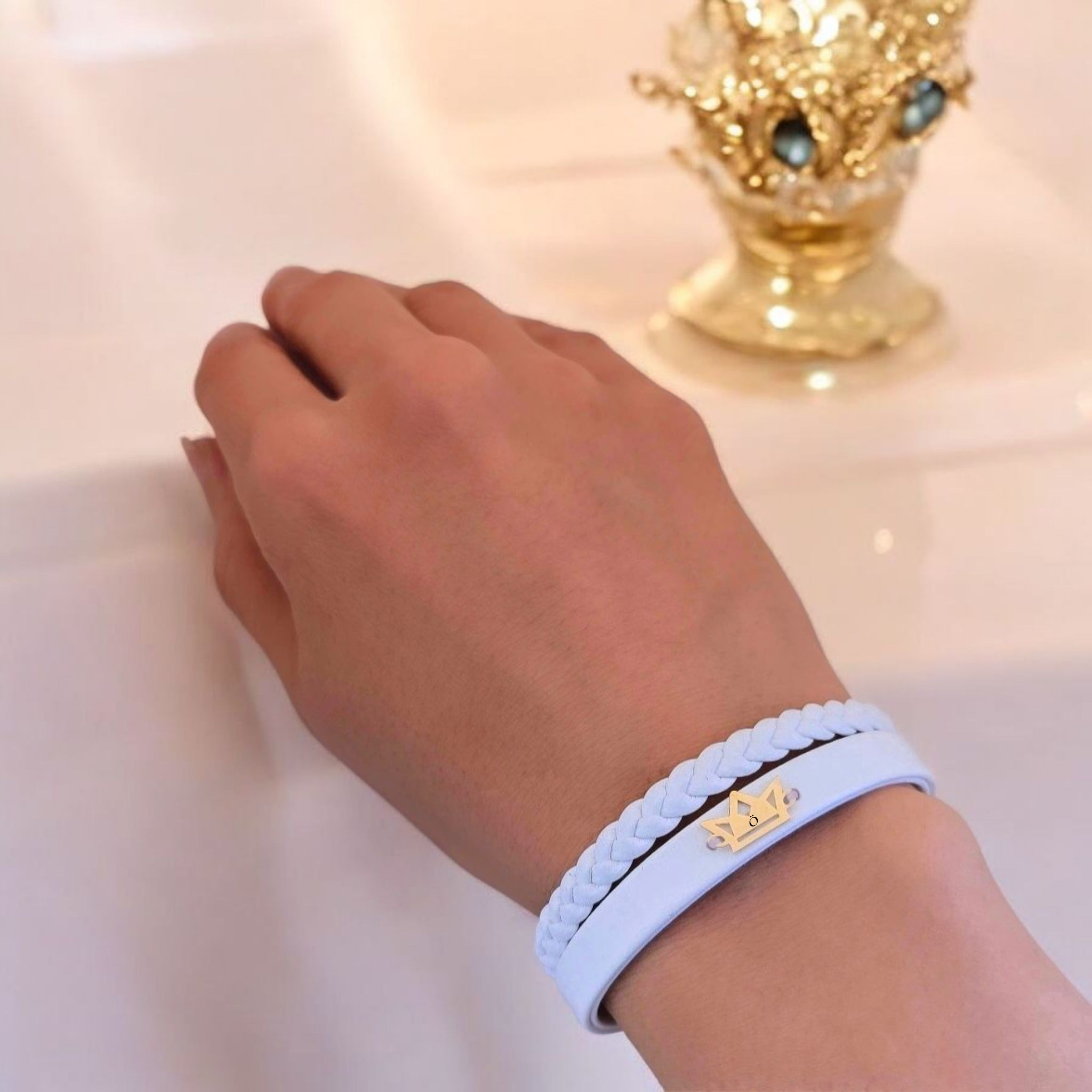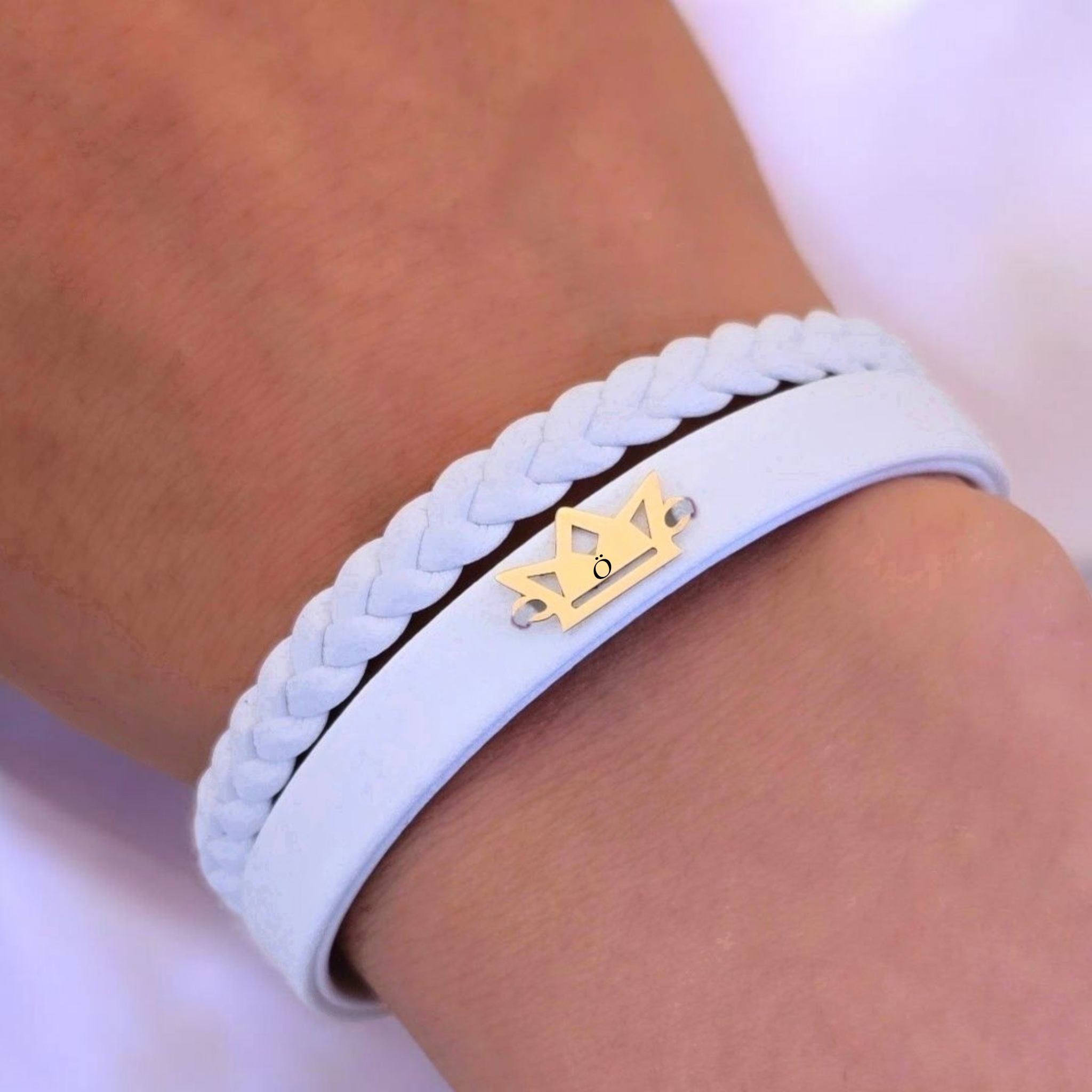 “14 Ayar Altın Plakalı Harfe Özel Doğal Beyaz Derili Taç Figürlü Hediye Bileklik-500” için yorum yapan ilk kişi siz olun