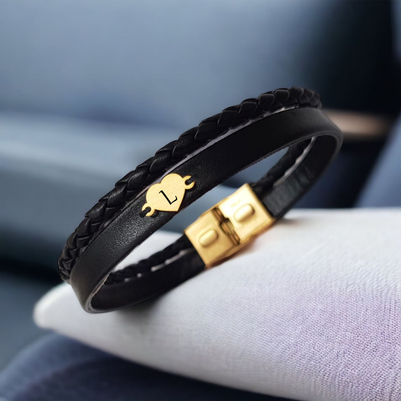 14 Ayar Altın Plakalı Harfe Özel Doğal Siyah Derili Kalp Motifli Hediye Bileklik-549
