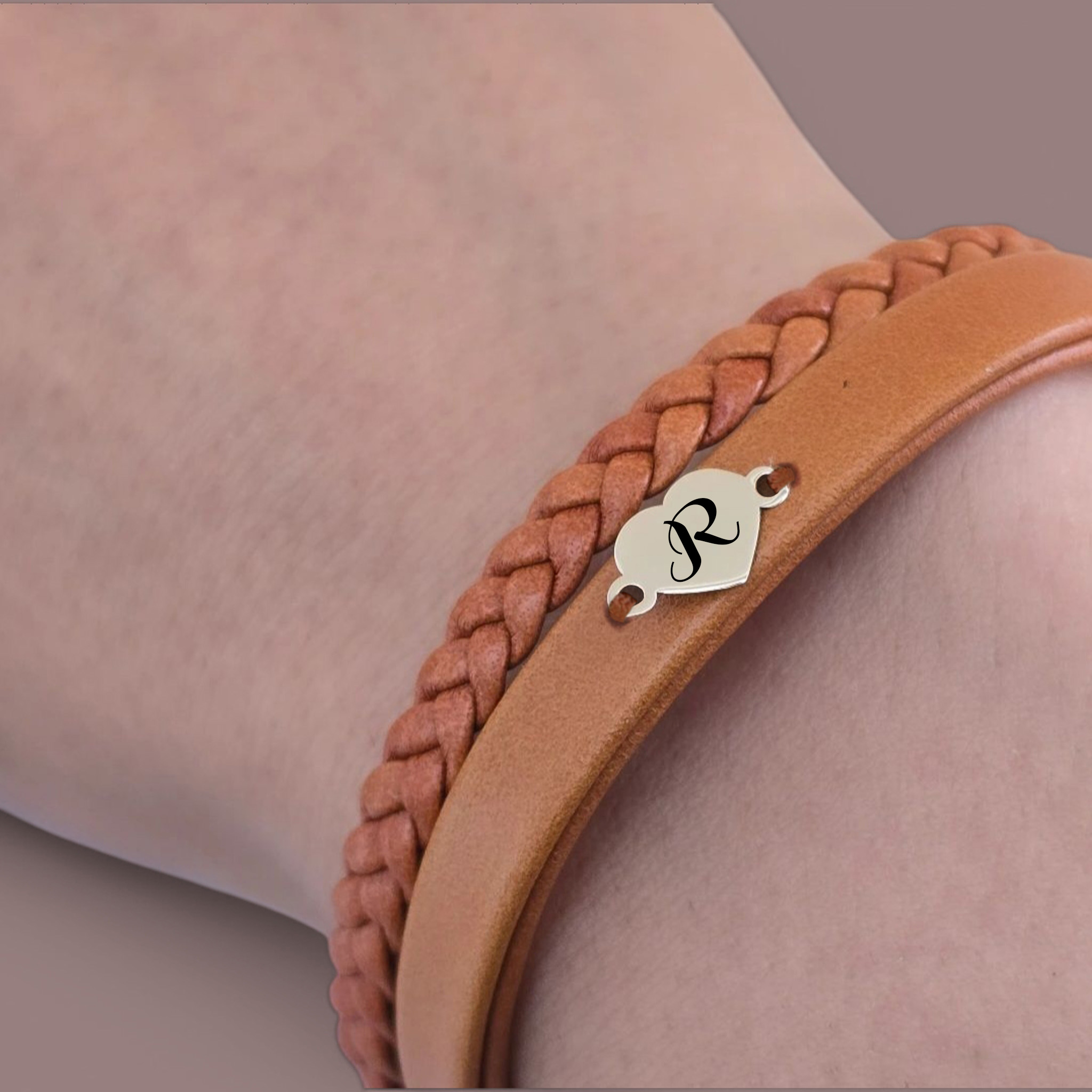14 Ayar Altın Plakalı Harfe Özel Kalp Figürlü Doğal Kahverengi Derili Hediye Bileklik-401