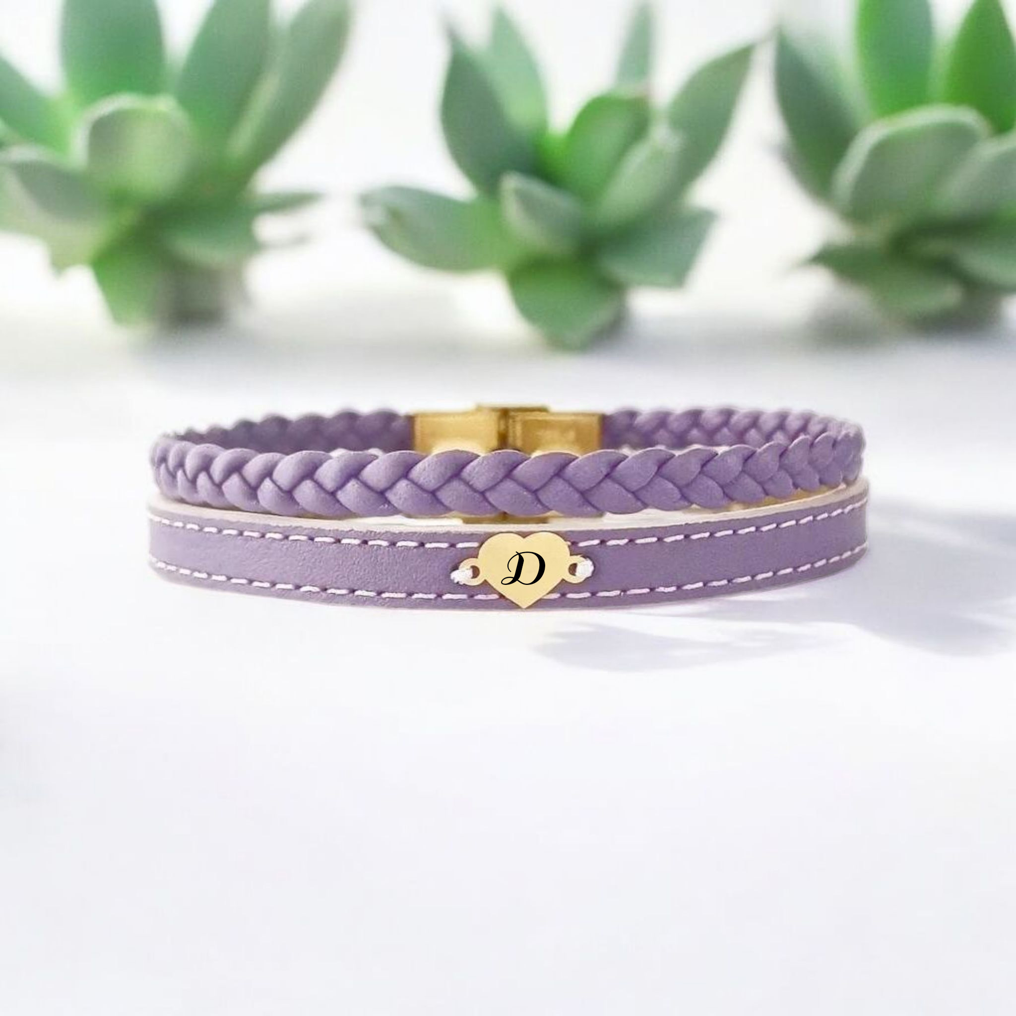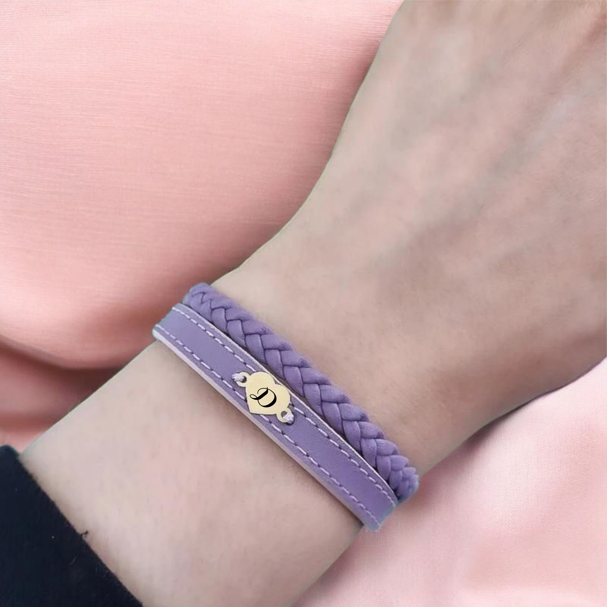 14 Ayar Altın Plakalı Harfe Özel Kalp Motifli Doğal Mor Derili Hediye Bileklik-453