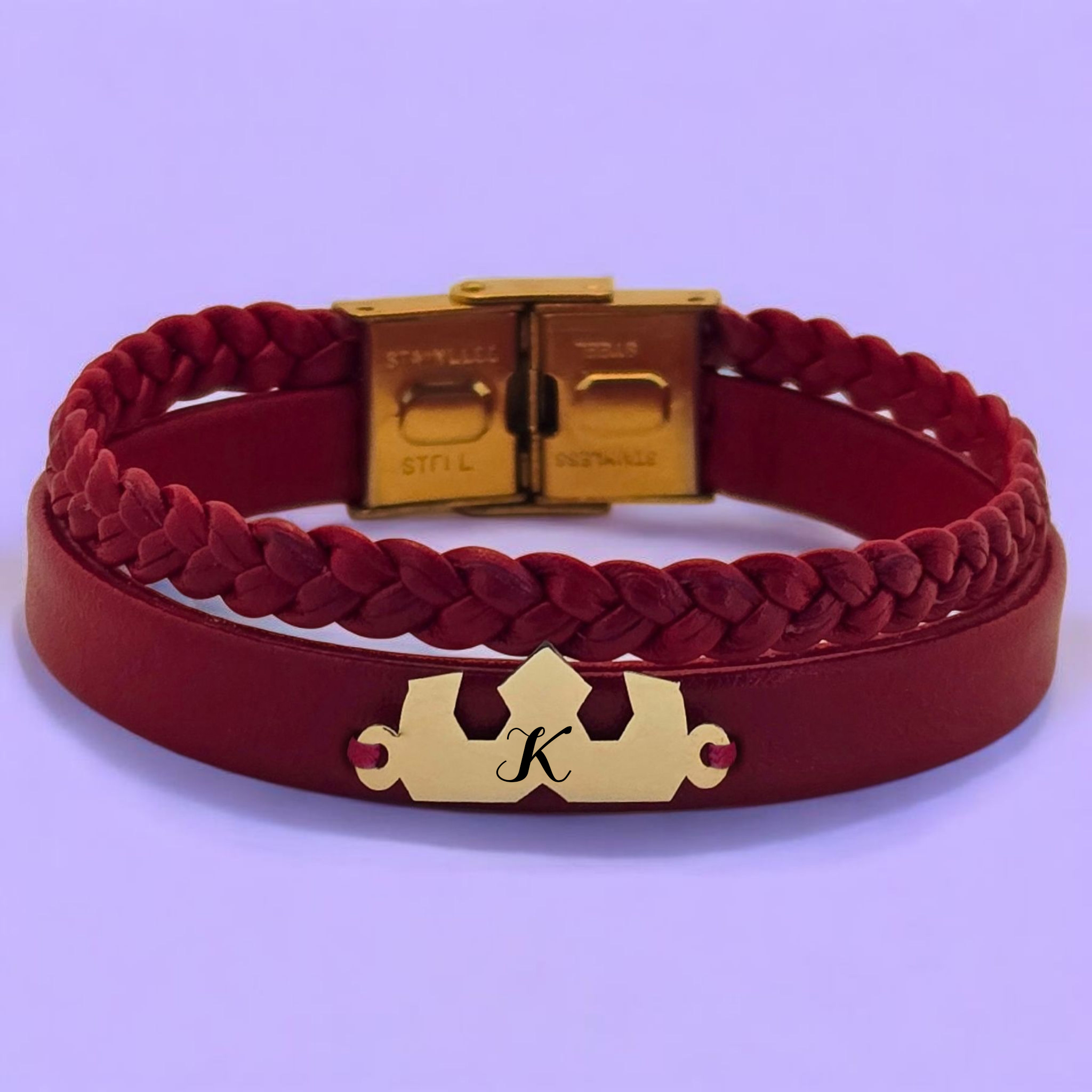 14 Ayar Altın Plakalı Harfe Özel Taç Figürlü Bordo Derili Hediye Bileklik-470