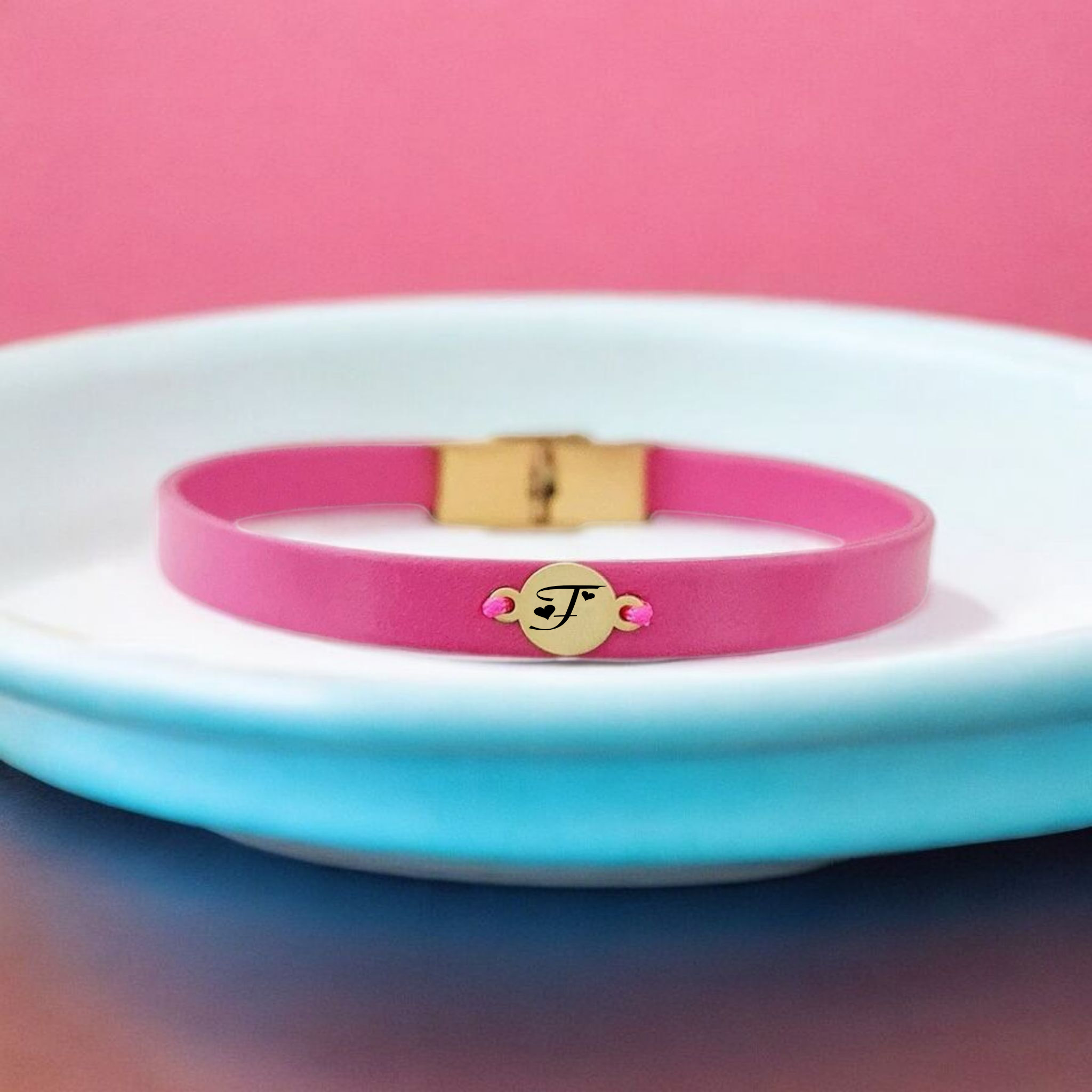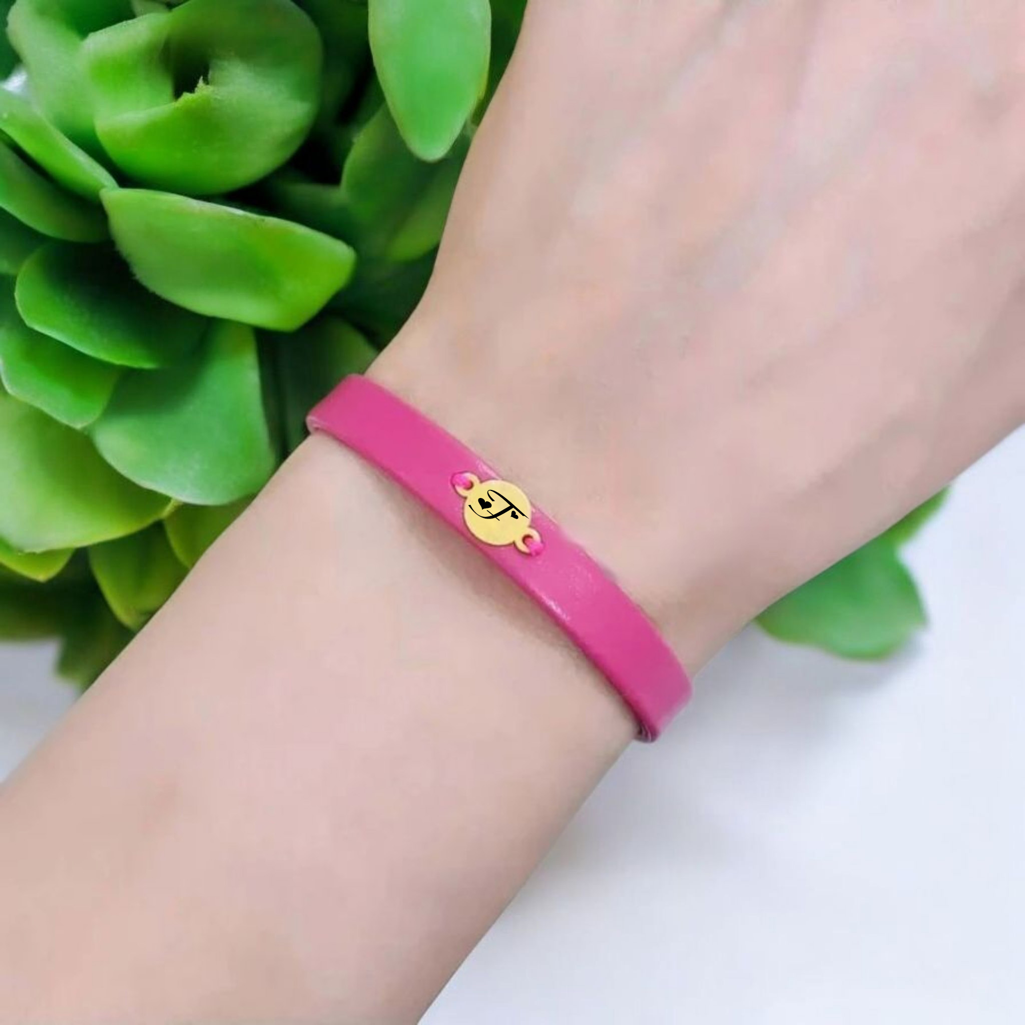 “14 Ayar Altın Plakalı Harfe Özel Yuvarlak Motifli Doğal Pembe Derili Hediye Bileklik-394” için yorum yapan ilk kişi siz olun