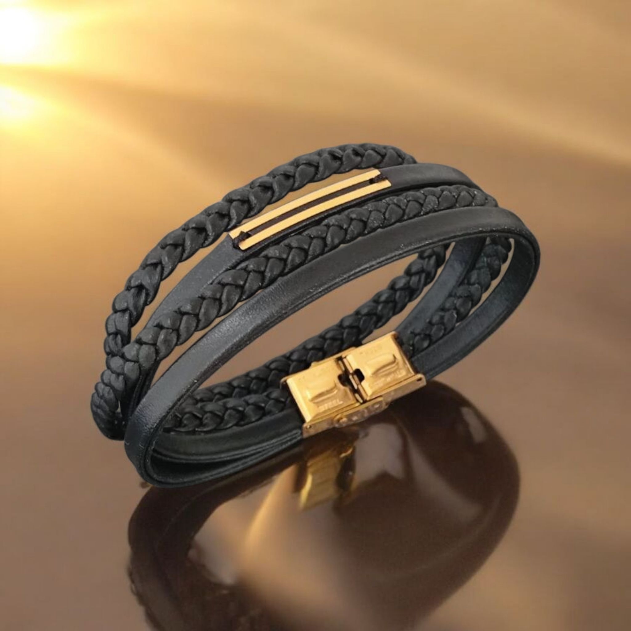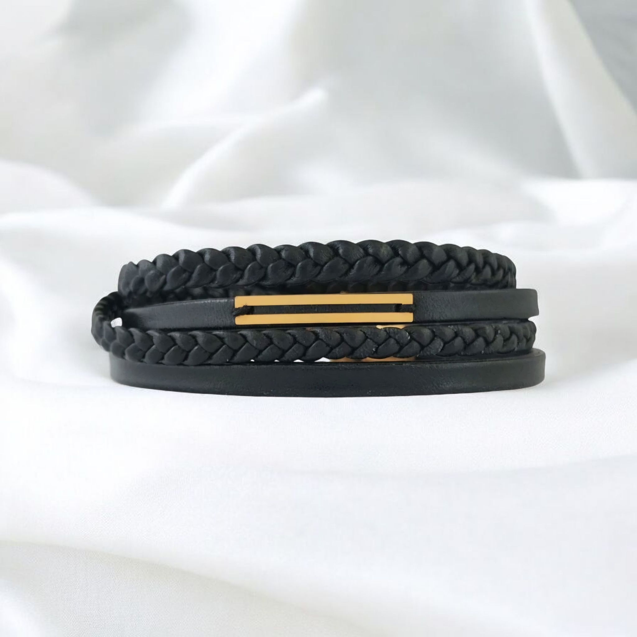 14 Ayar Altın Plakalı İnce Dikdörtgen Figürlü Erkeklere Özel Hakiki Siyah Derili Hediye Bileklik-388