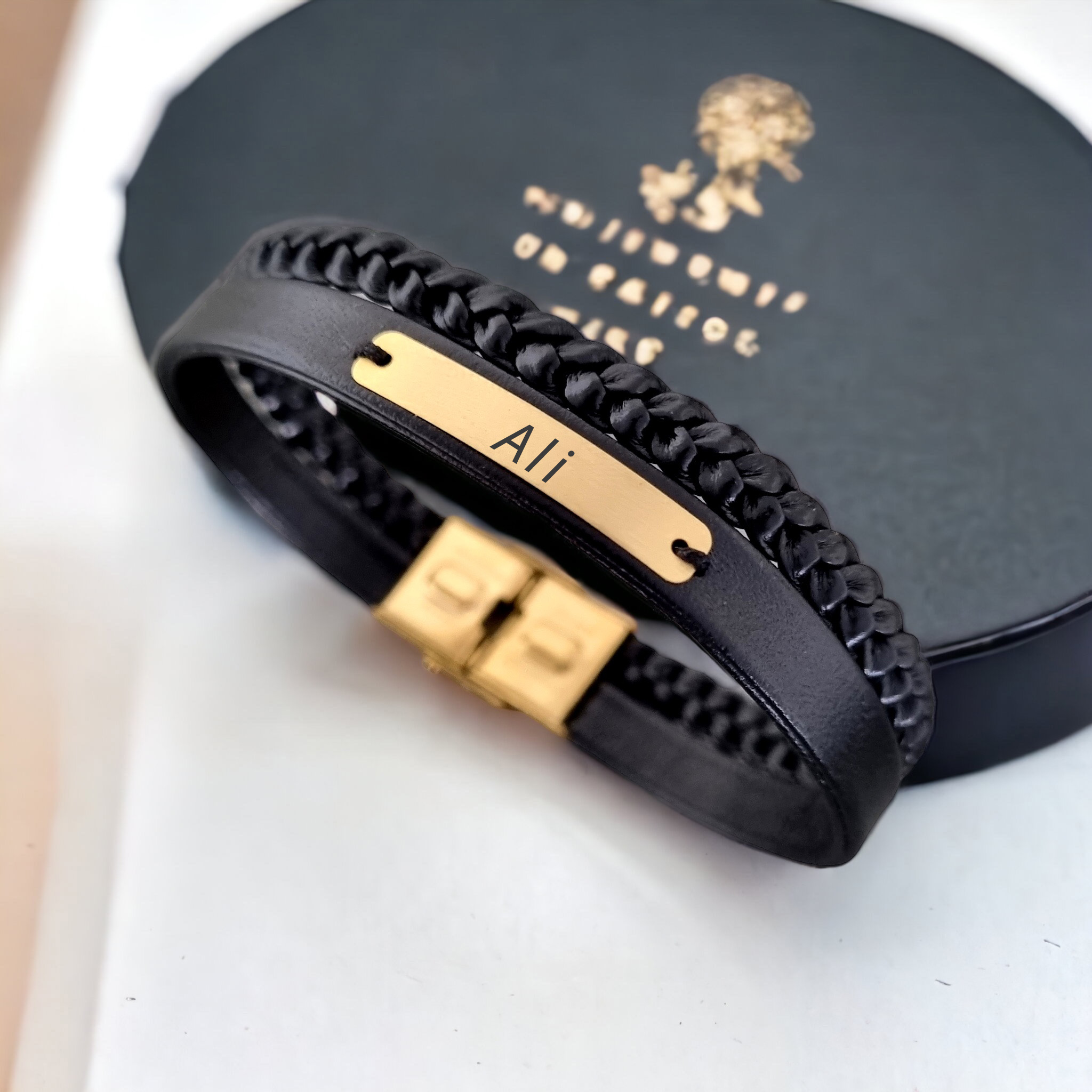 14 Ayar Altın Plakalı İsme Özel Dikdörtgen Motifli Hakiki Siyah Derili Hediye Bileklik-537
