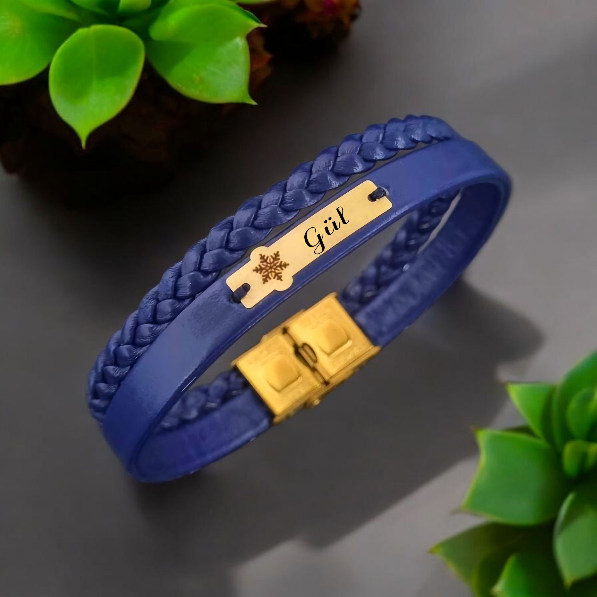 14 Ayar Altın Plakalı İsme Özel Doğal Lacivert Derili Kar Tanesi Motifli Hediye Bileklik-451