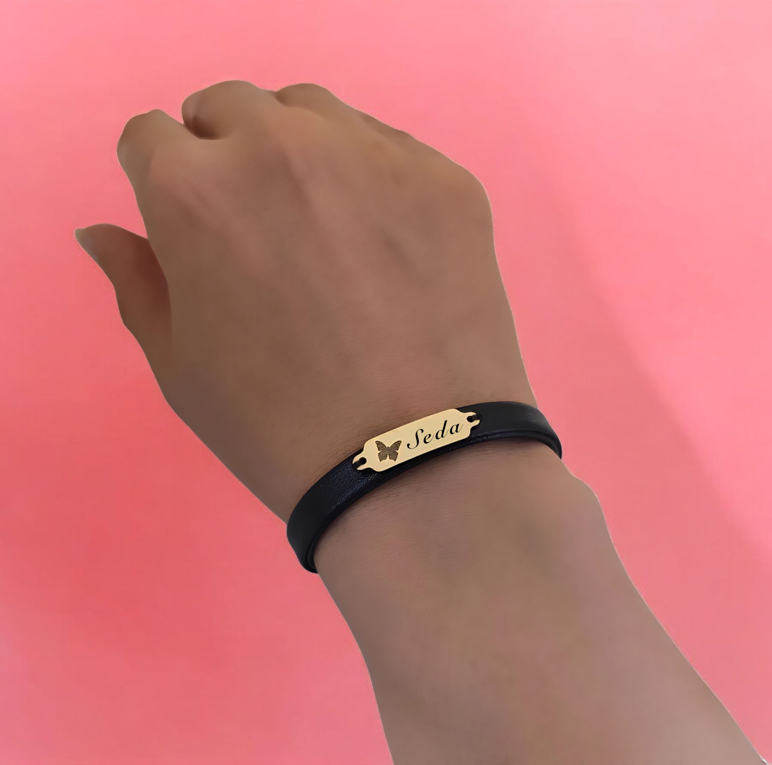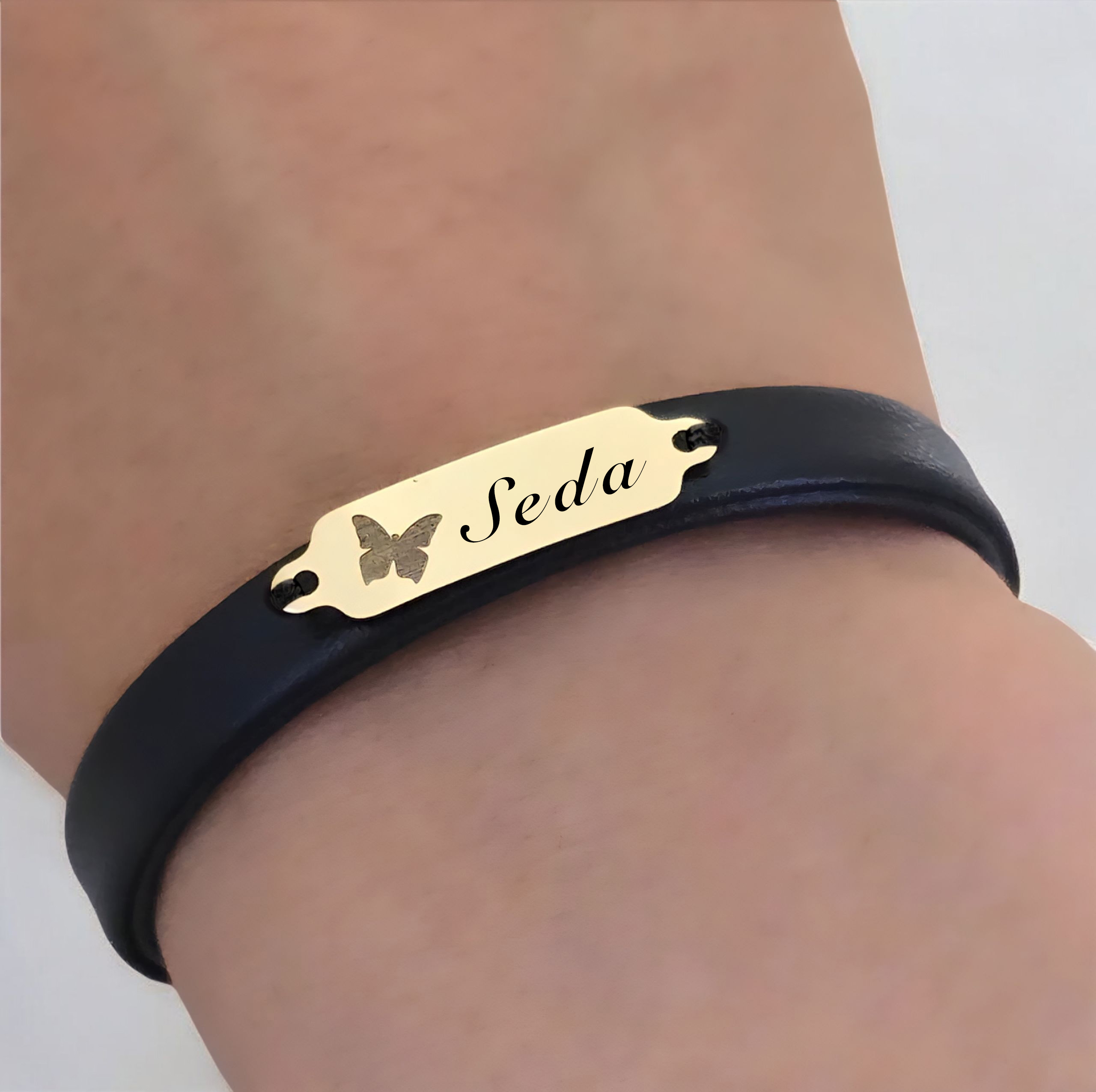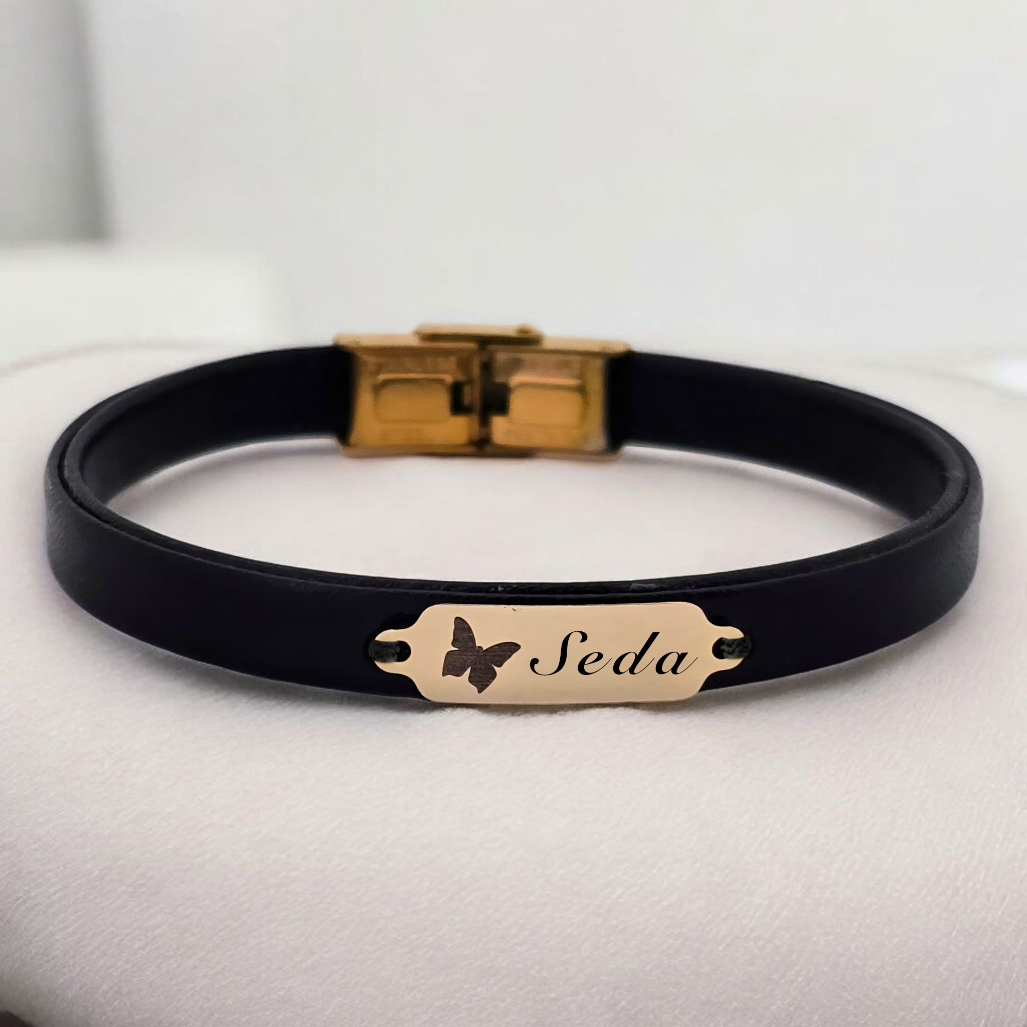 14 Ayar Altın Plakalı İsme Özel Doğal Siyah Derili Kelebek Figürlü Hediye Bileklik-646
