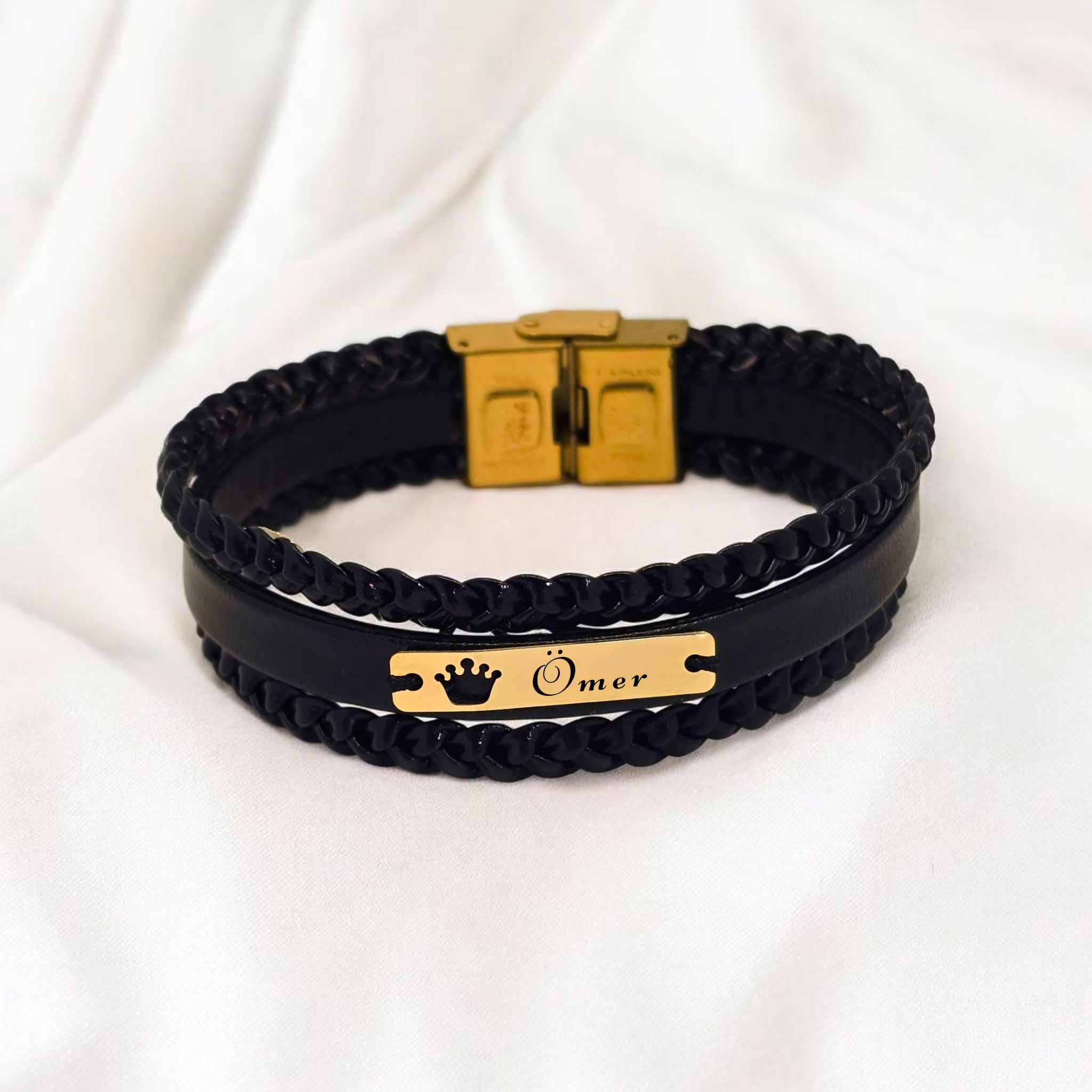 14 Ayar Altın Plakalı İsme Özel Hakiki Siyah Derili Taç Motifli Hediye Bileklik-397
