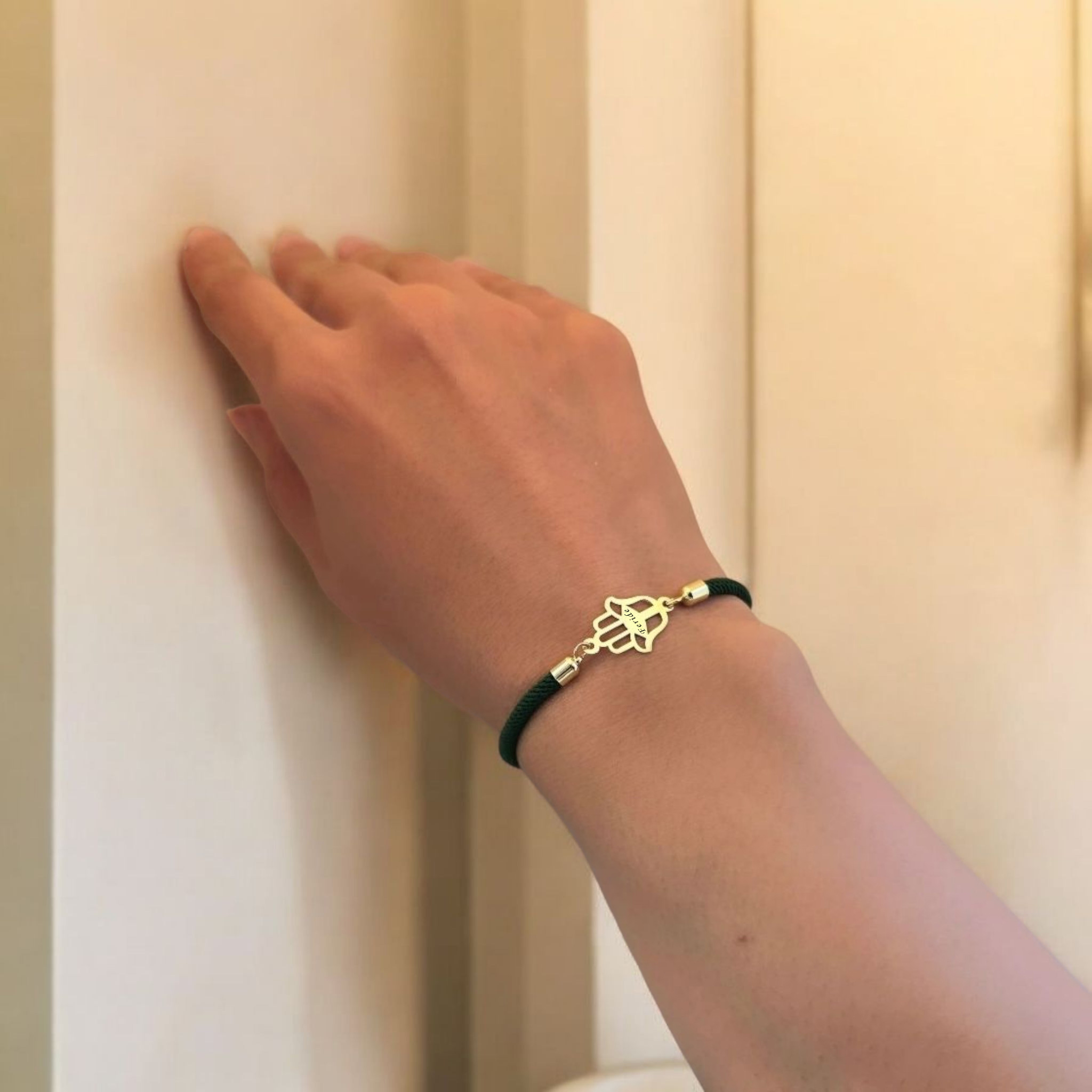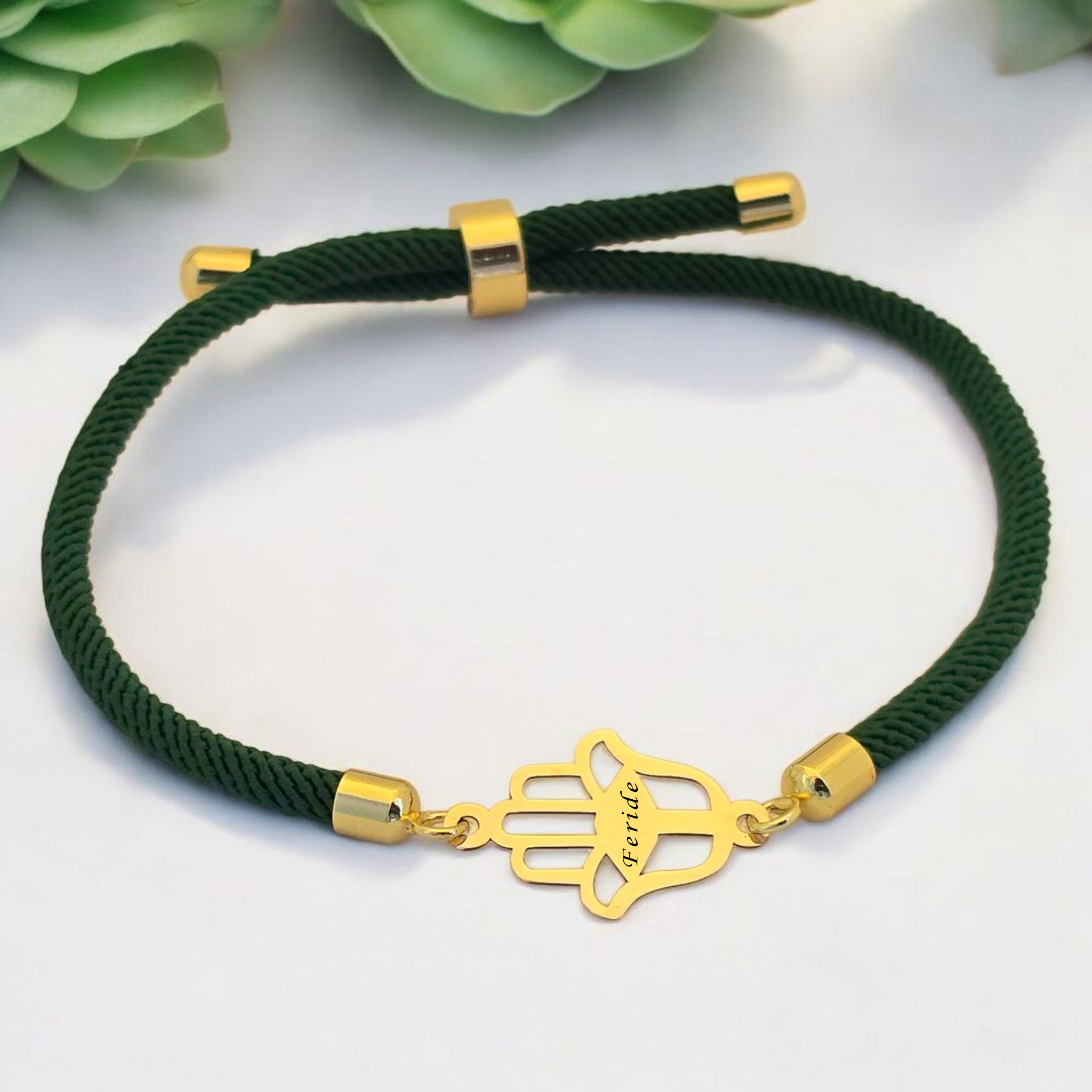 14 Ayar Altın Plakalı İsme Özel Hamsa Figürlü Koyu Yeşil İpek Örgülü Hediye Bileklik-498