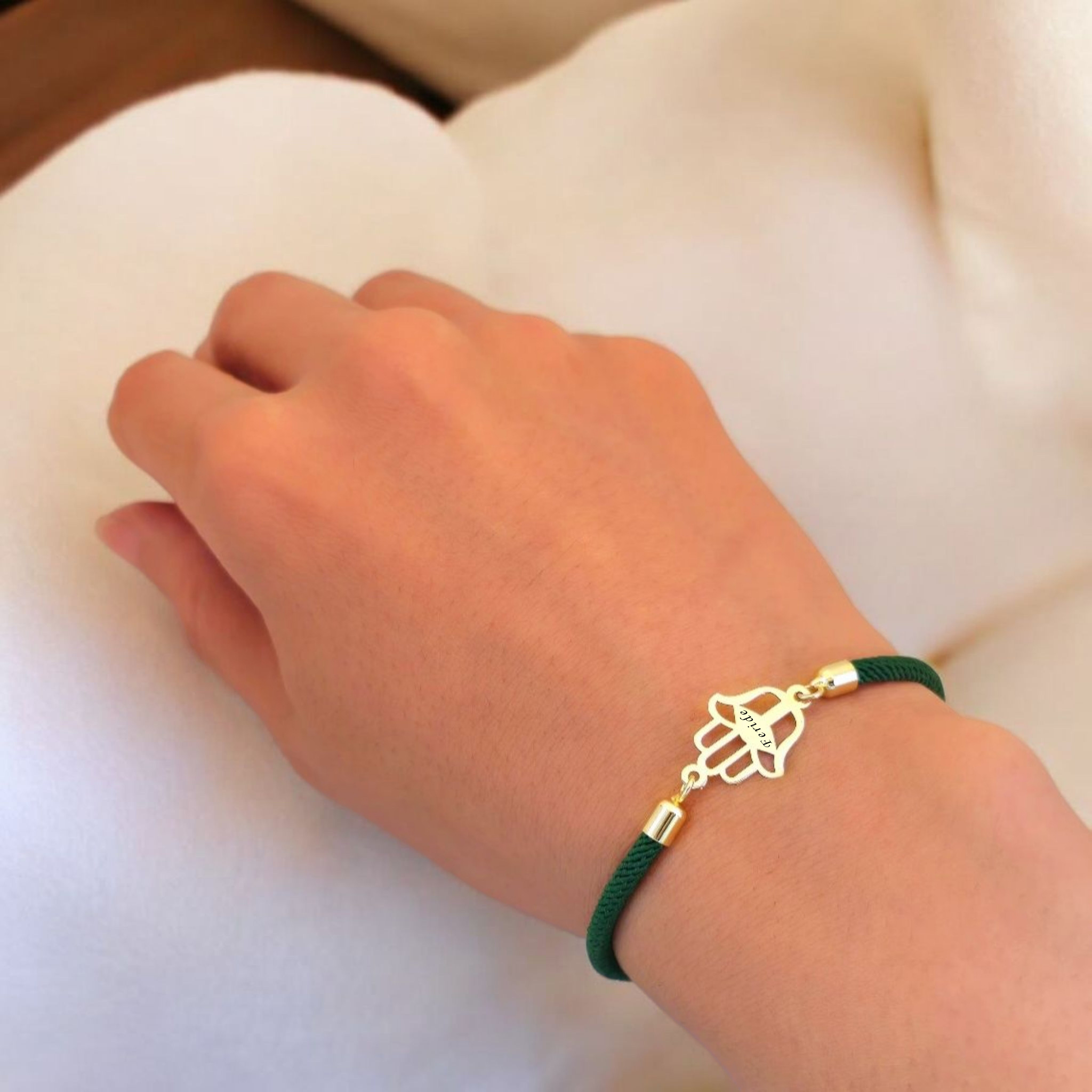 “14 Ayar Altın Plakalı İsme Özel Hamsa Figürlü Koyu Yeşil İpek Örgülü Hediye Bileklik-498” için yorum yapan ilk kişi siz olun