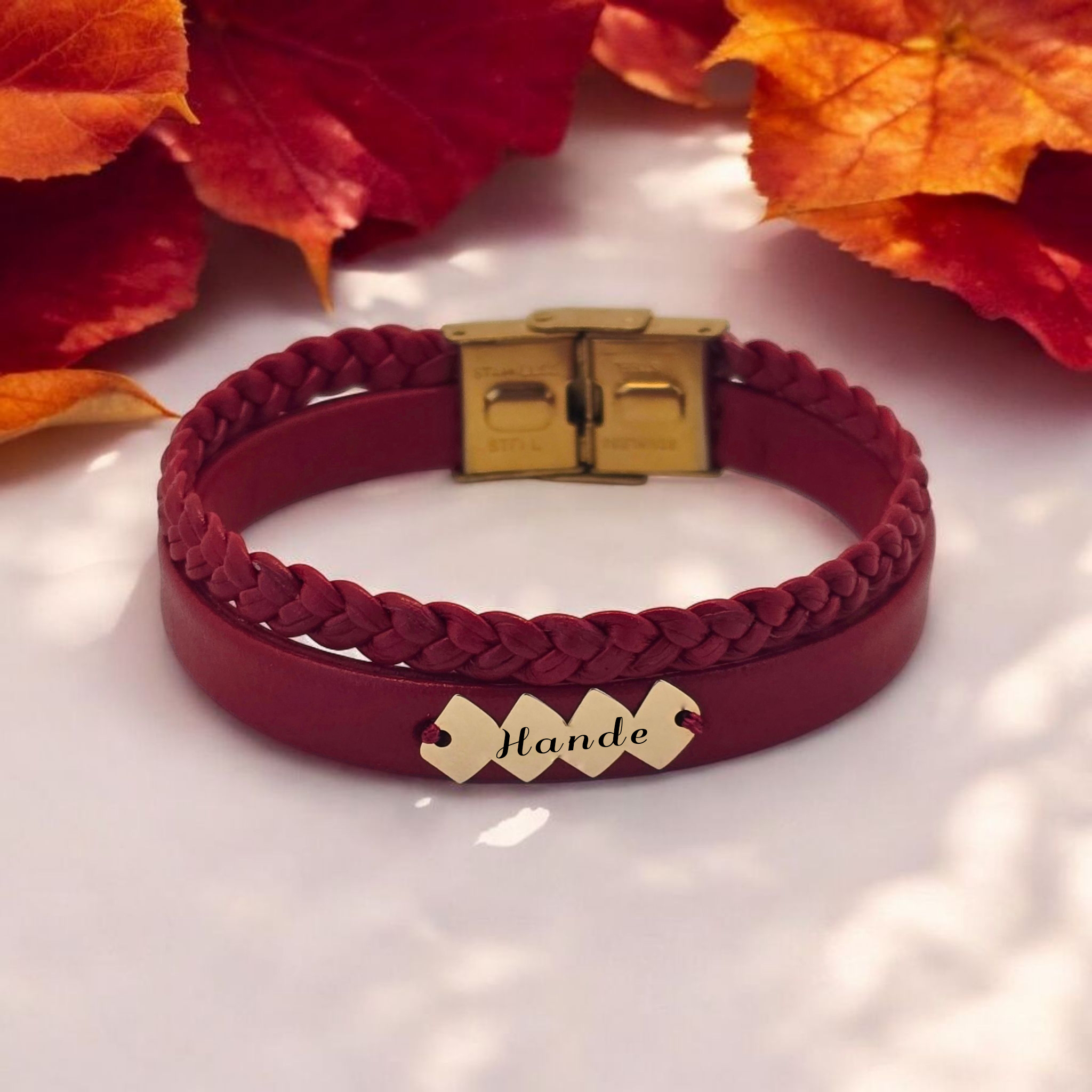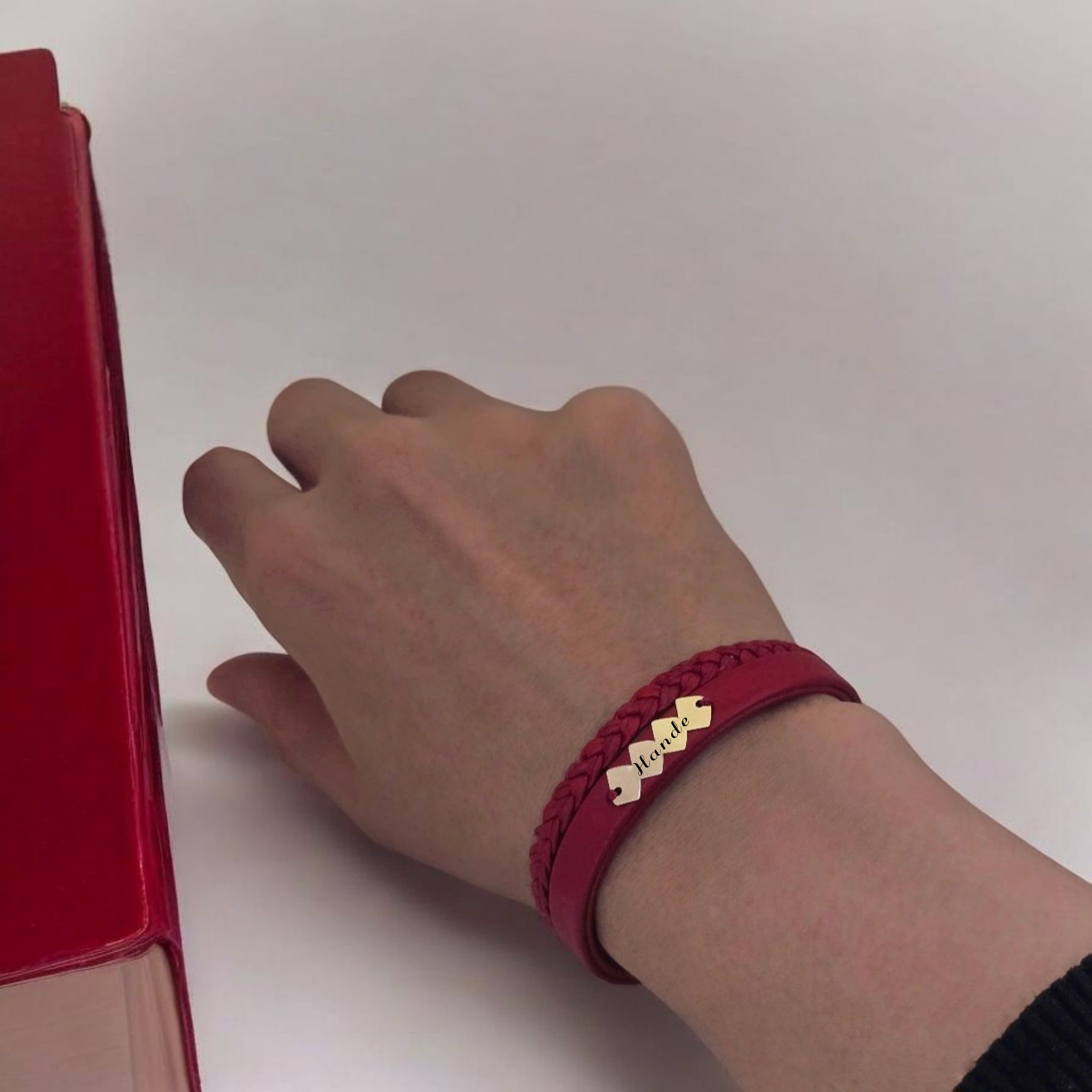 “14 Ayar Altın Plakalı İsme Özel Hayat Döngüsü Figürlü Koyu Kırmızı Derili Hediye Bileklik-373” için yorum yapan ilk kişi siz olun