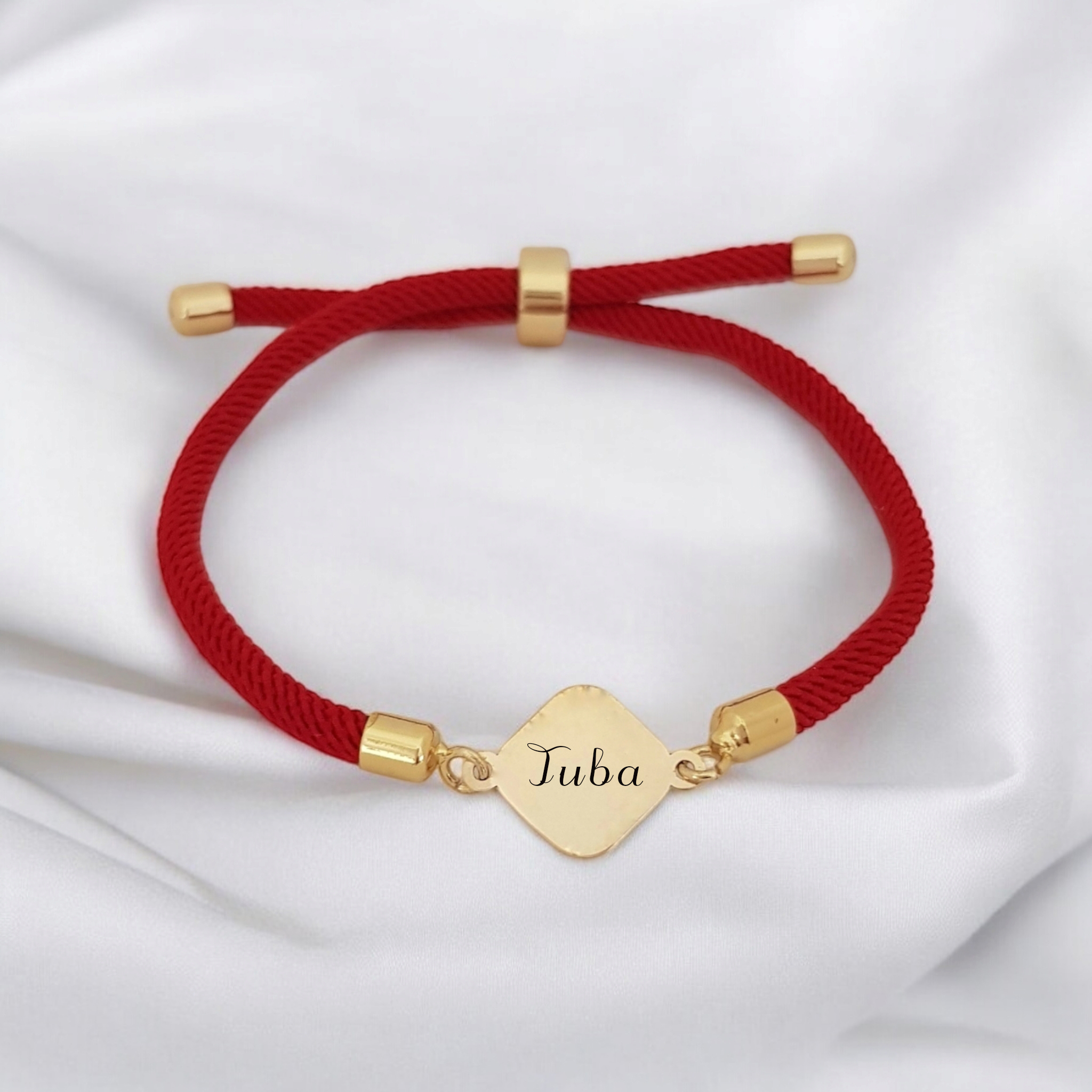 14 Ayar Altın Plakalı İsme Özel Kırmızı İpek Örgülü Eşkenar Dörtgenli Hediye Bileklik-326