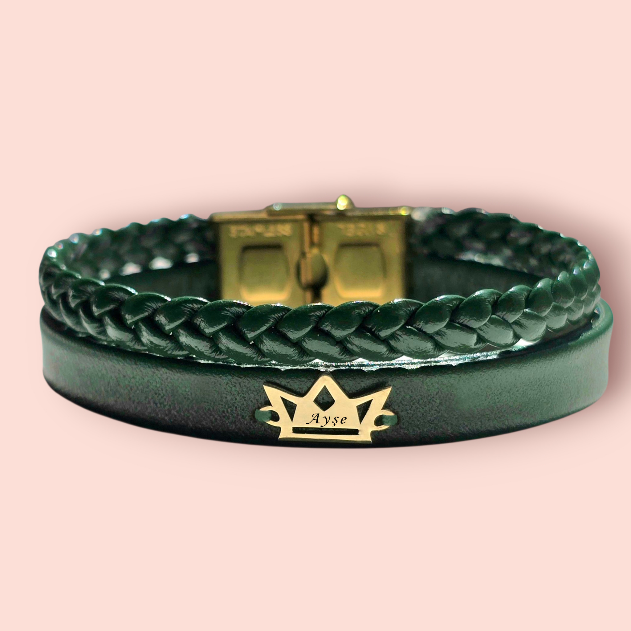 14 Ayar Altın Plakalı İsme Özel Taç Motifli Koyu Yeşil Derili Hediye Bileklik-494