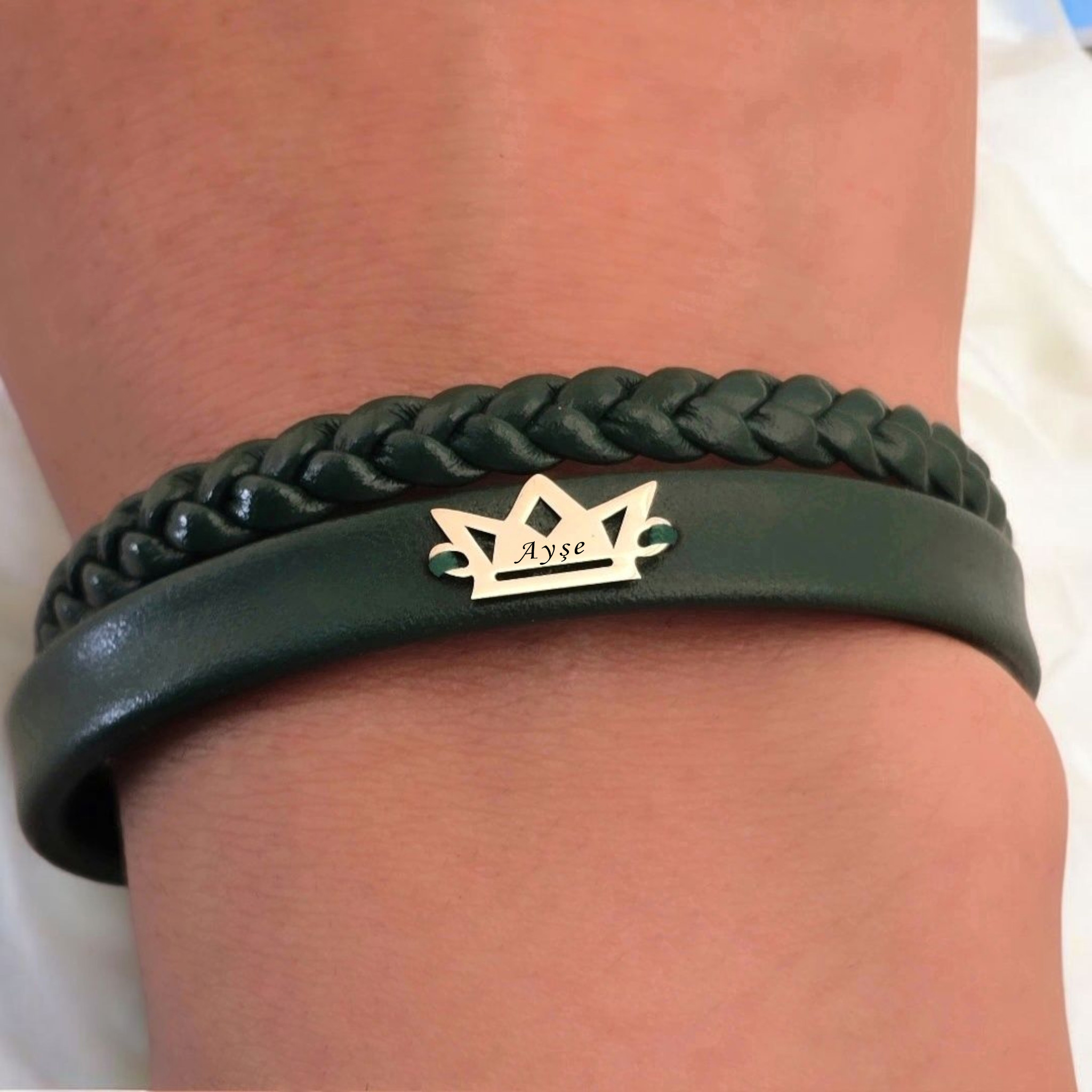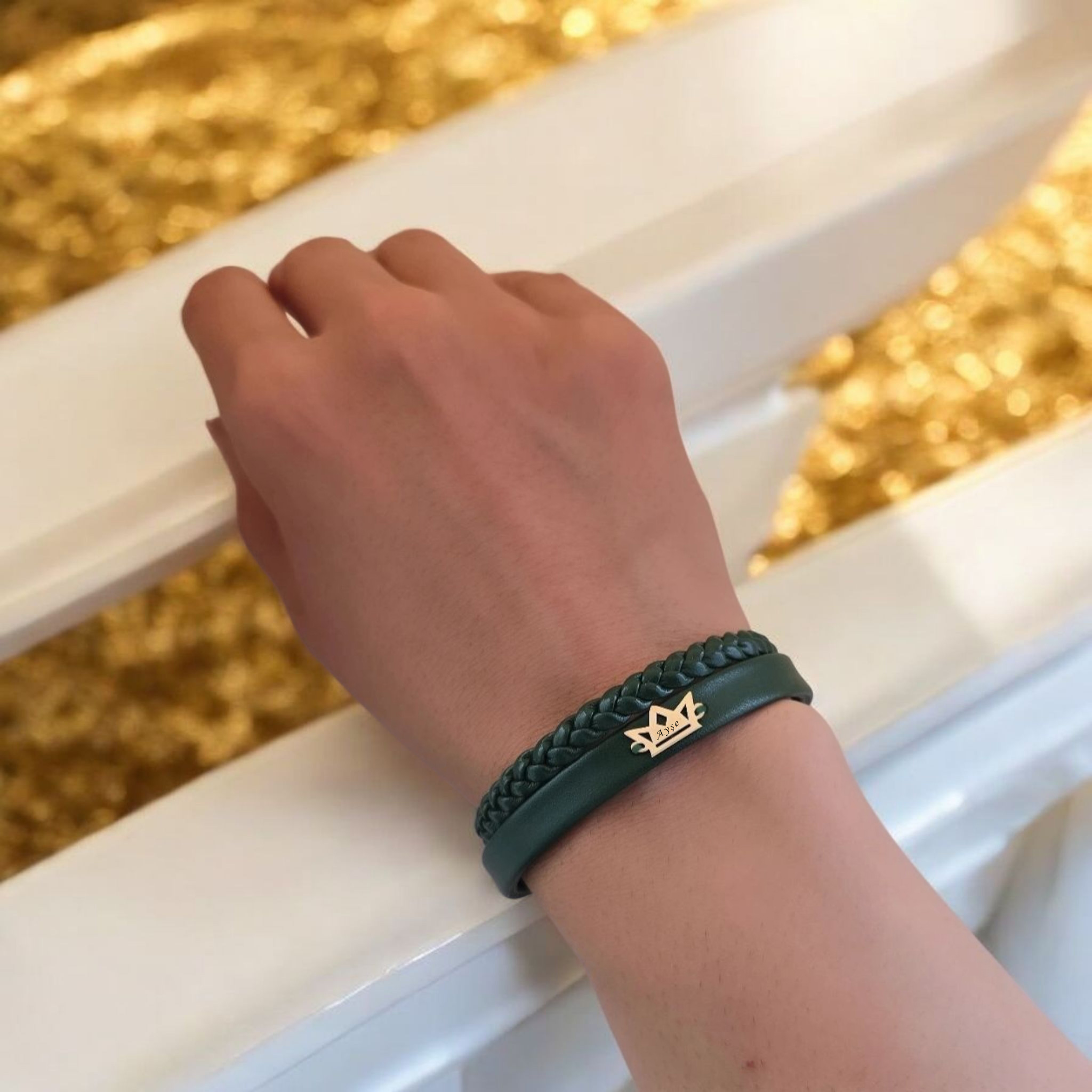“14 Ayar Altın Plakalı İsme Özel Taç Motifli Koyu Yeşil Derili Hediye Bileklik-494” için yorum yapan ilk kişi siz olun