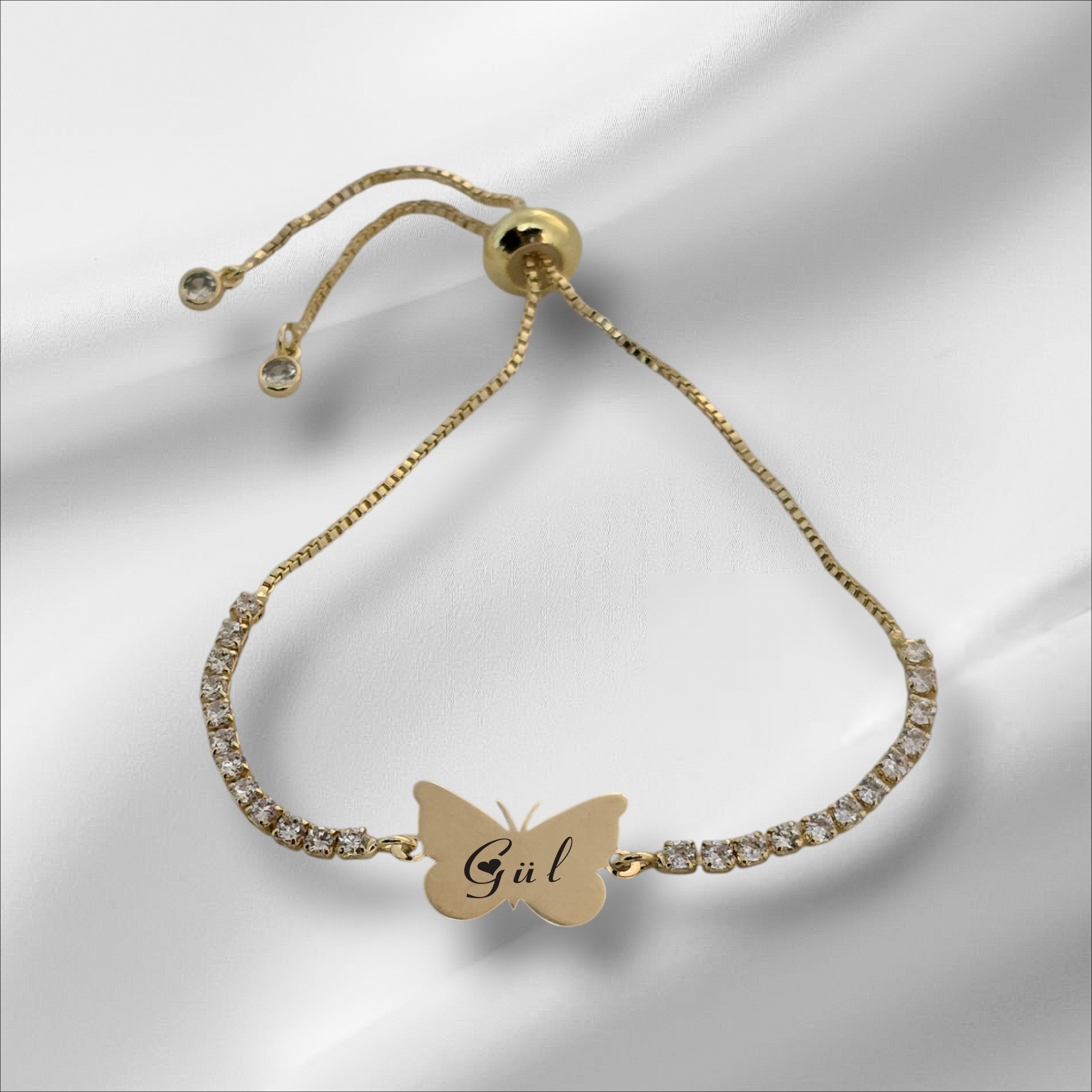 -Tasarım: Kelebek figürlü ve beyaz taş desenli.