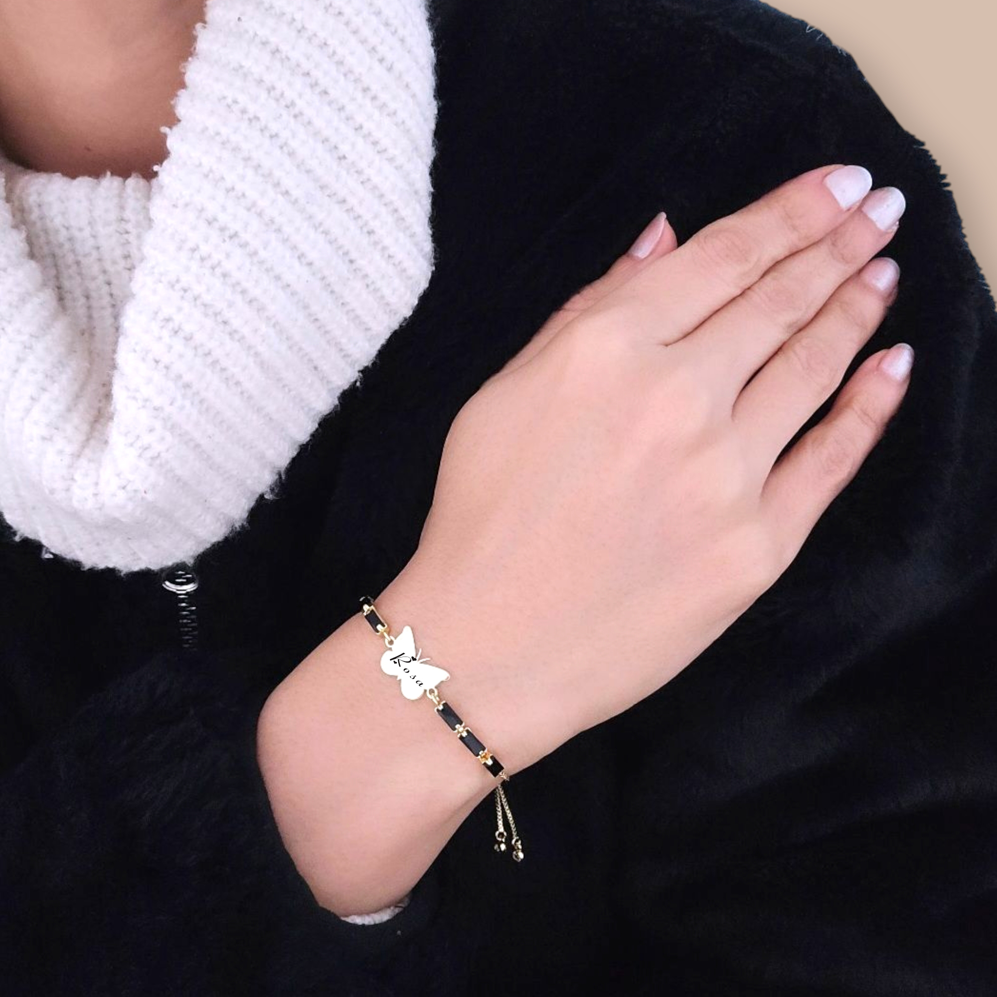 “14 Ayar Altın Plakalı İsme Özel Zincirli Siyah Taş Desenli Kelebek Motifli Hediye Bileklik-343” için yorum yapan ilk kişi siz olun