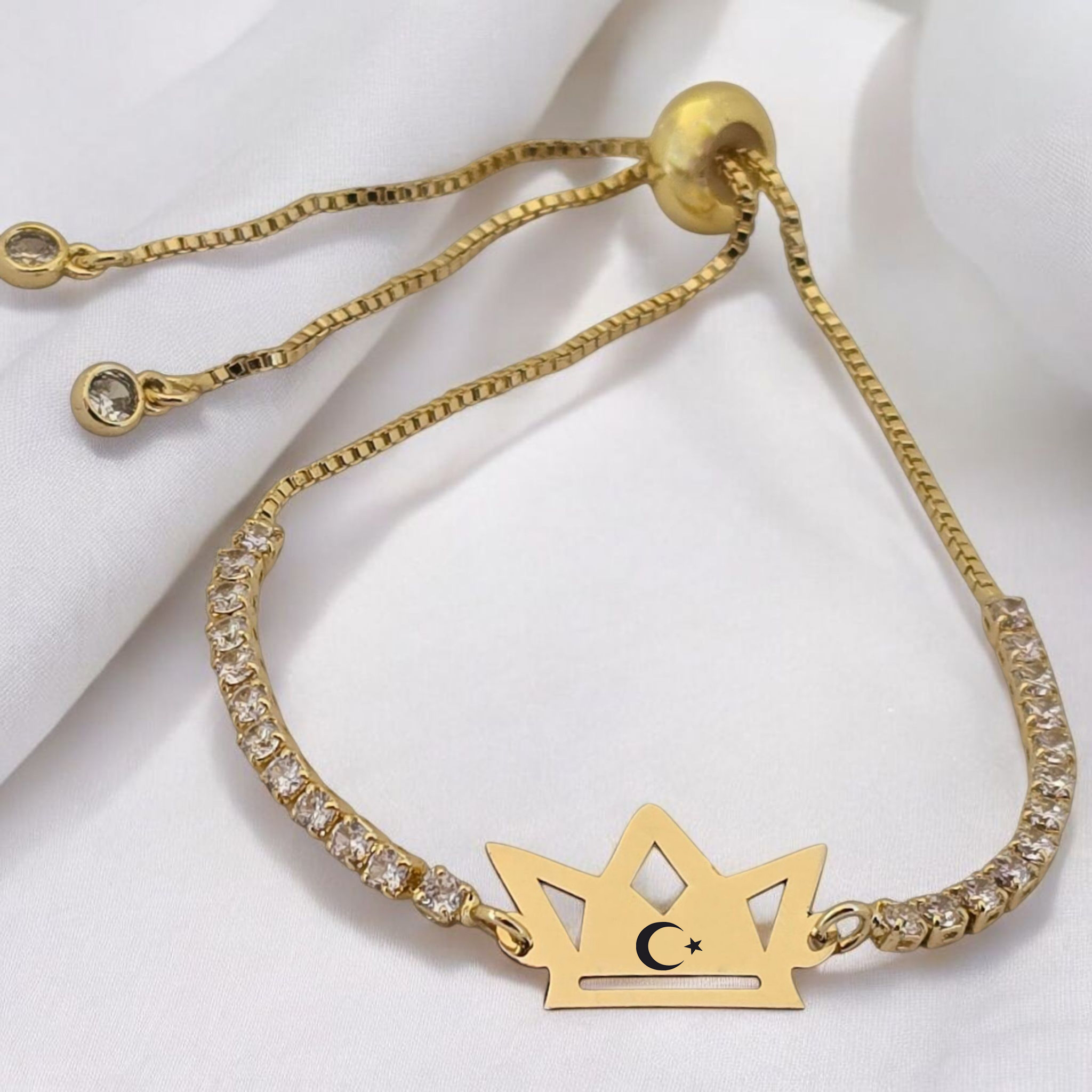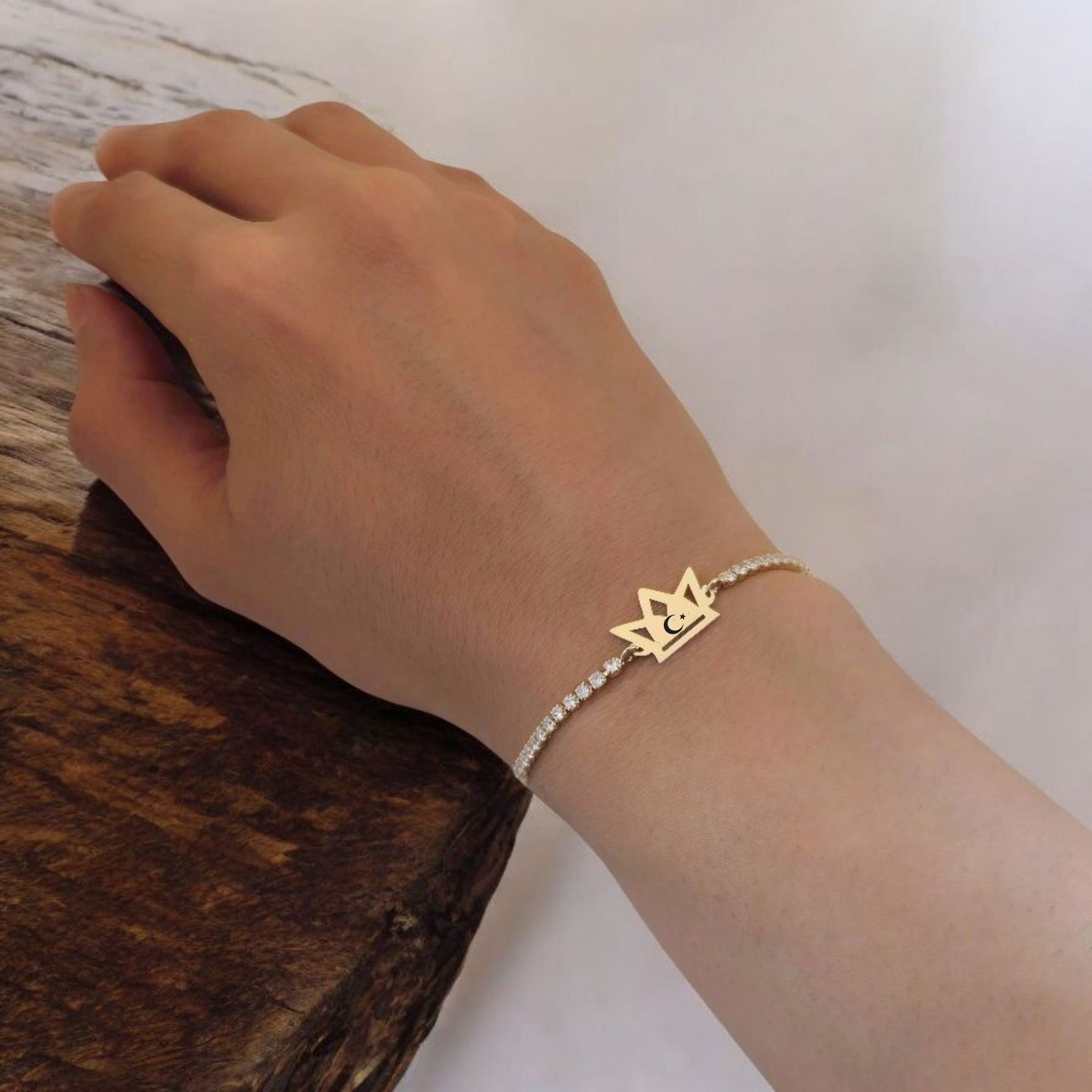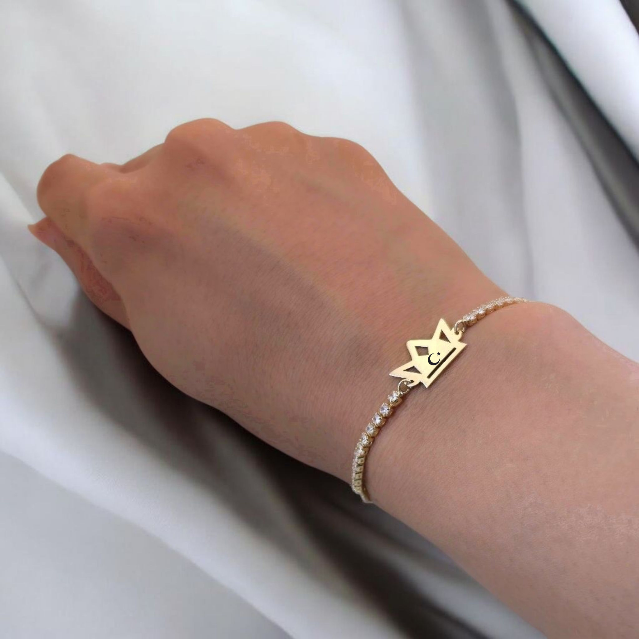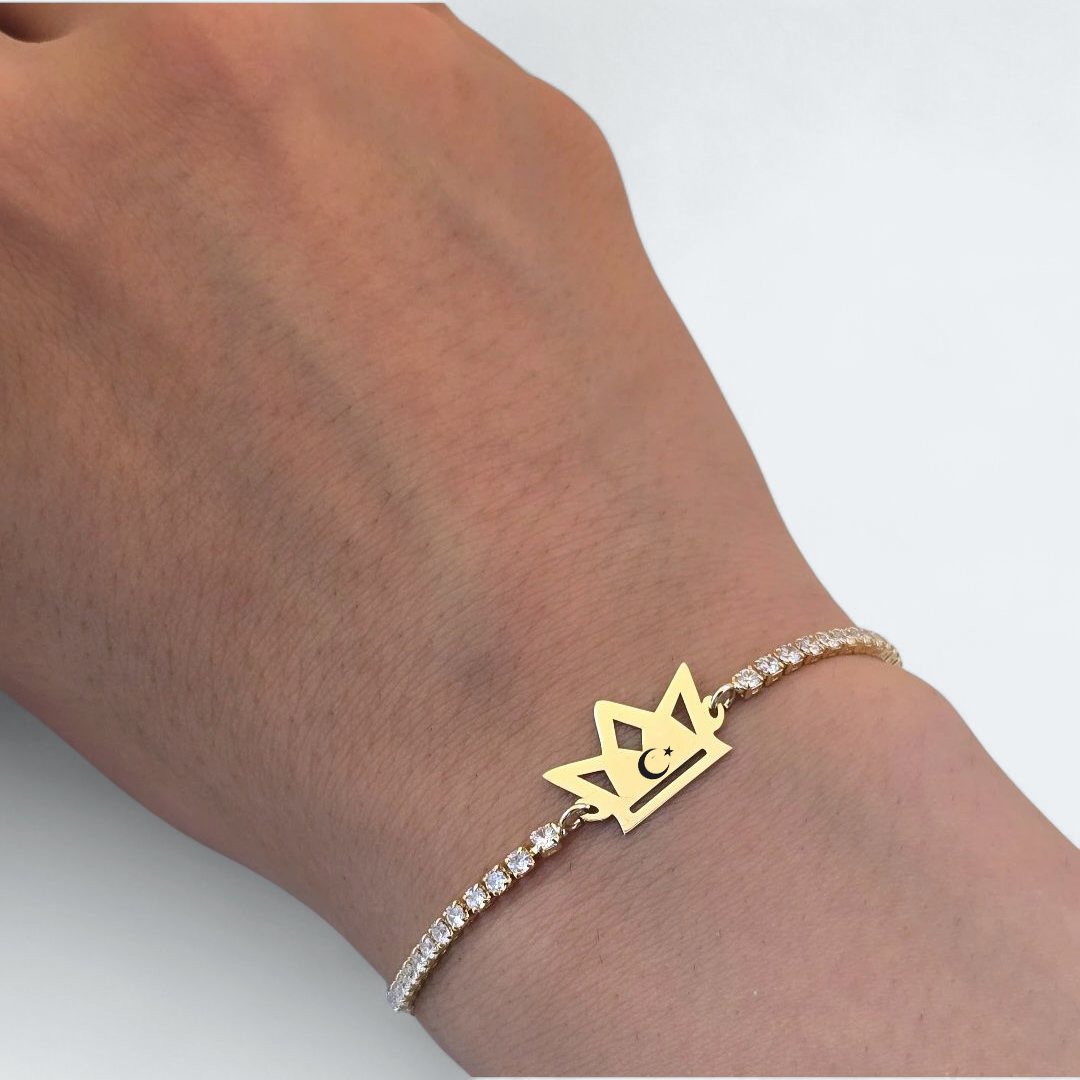 14 Ayar Altın Plakalı Sembole Özel Beyaz Taş Desenli Zincirli Taç Motifli Hediye Bileklik-471