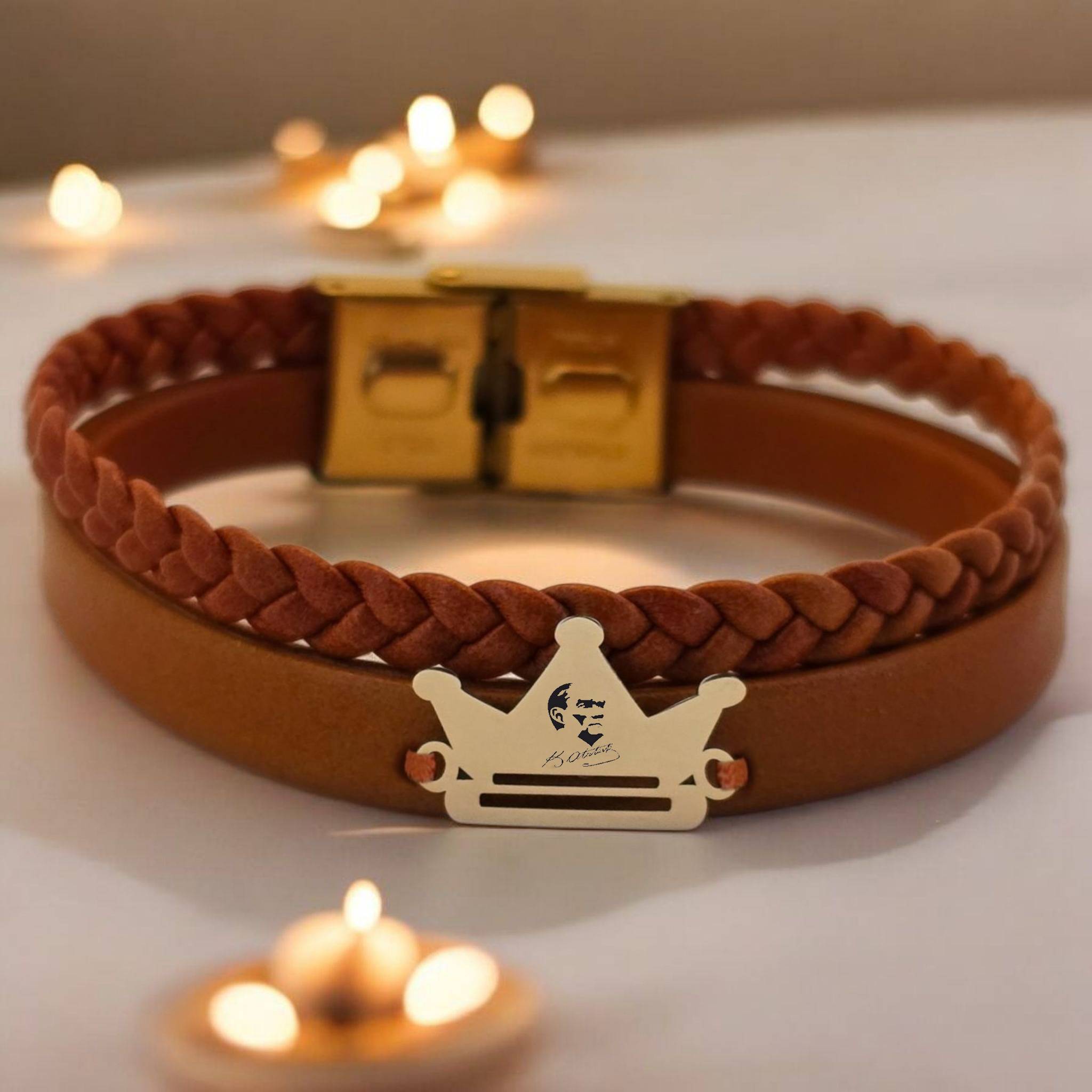 “14 Ayar Altın Plakalı Sembole Özel Doğal Kahverengi Derili Taç Motifli Hediye Bileklik-467” için yorum yapan ilk kişi siz olun