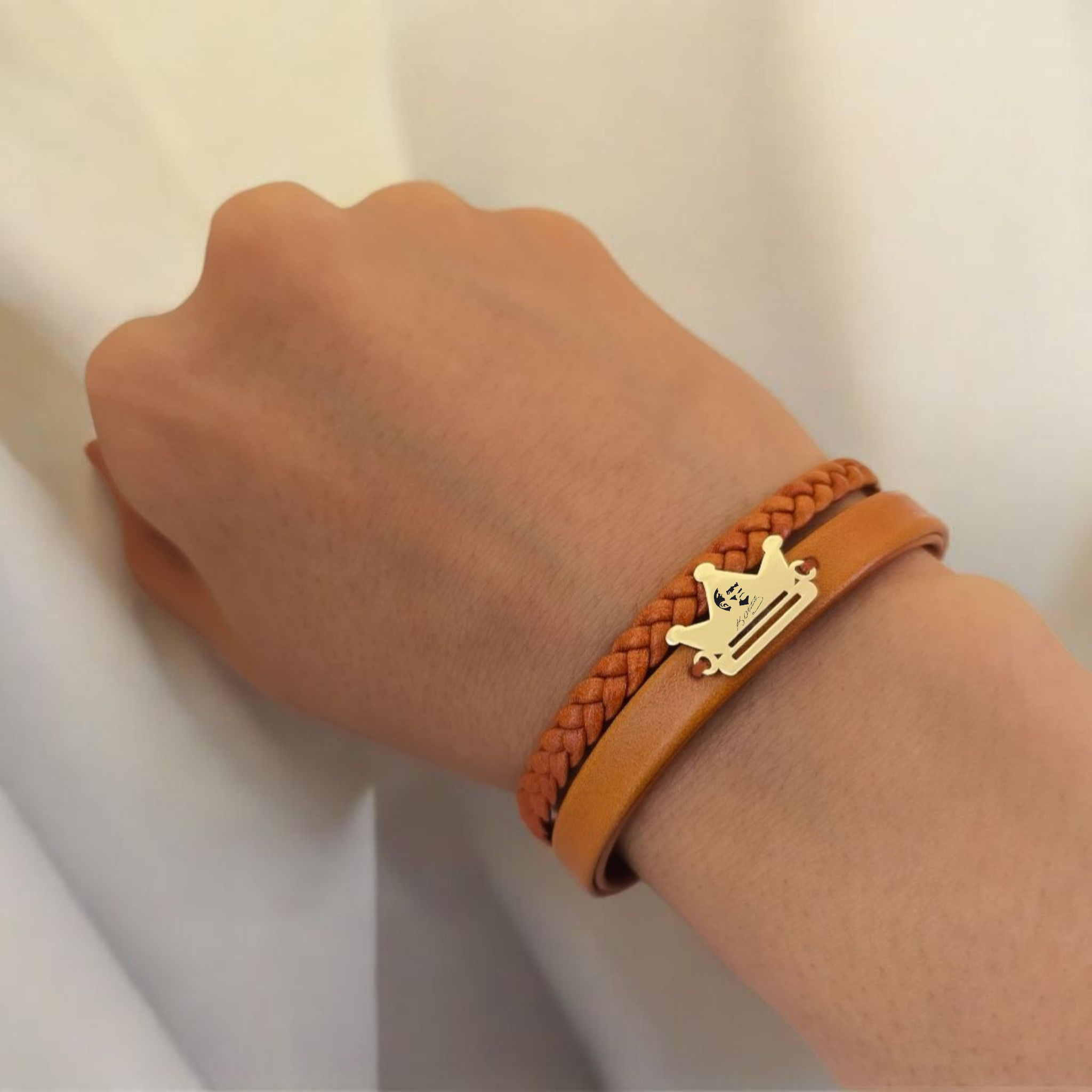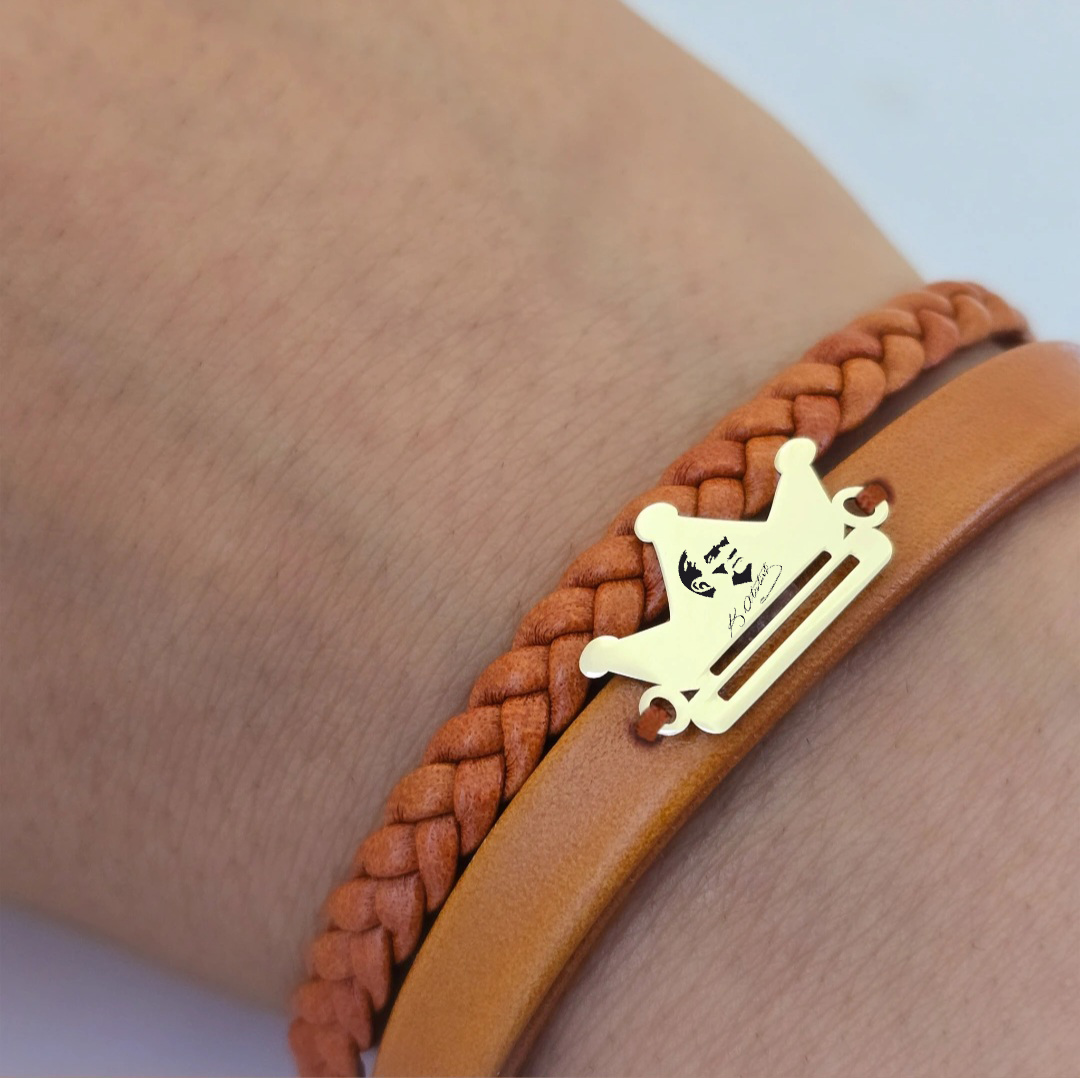 14 Ayar Altın Plakalı Sembole Özel Doğal Kahverengi Derili Taç Motifli Hediye Bileklik-467