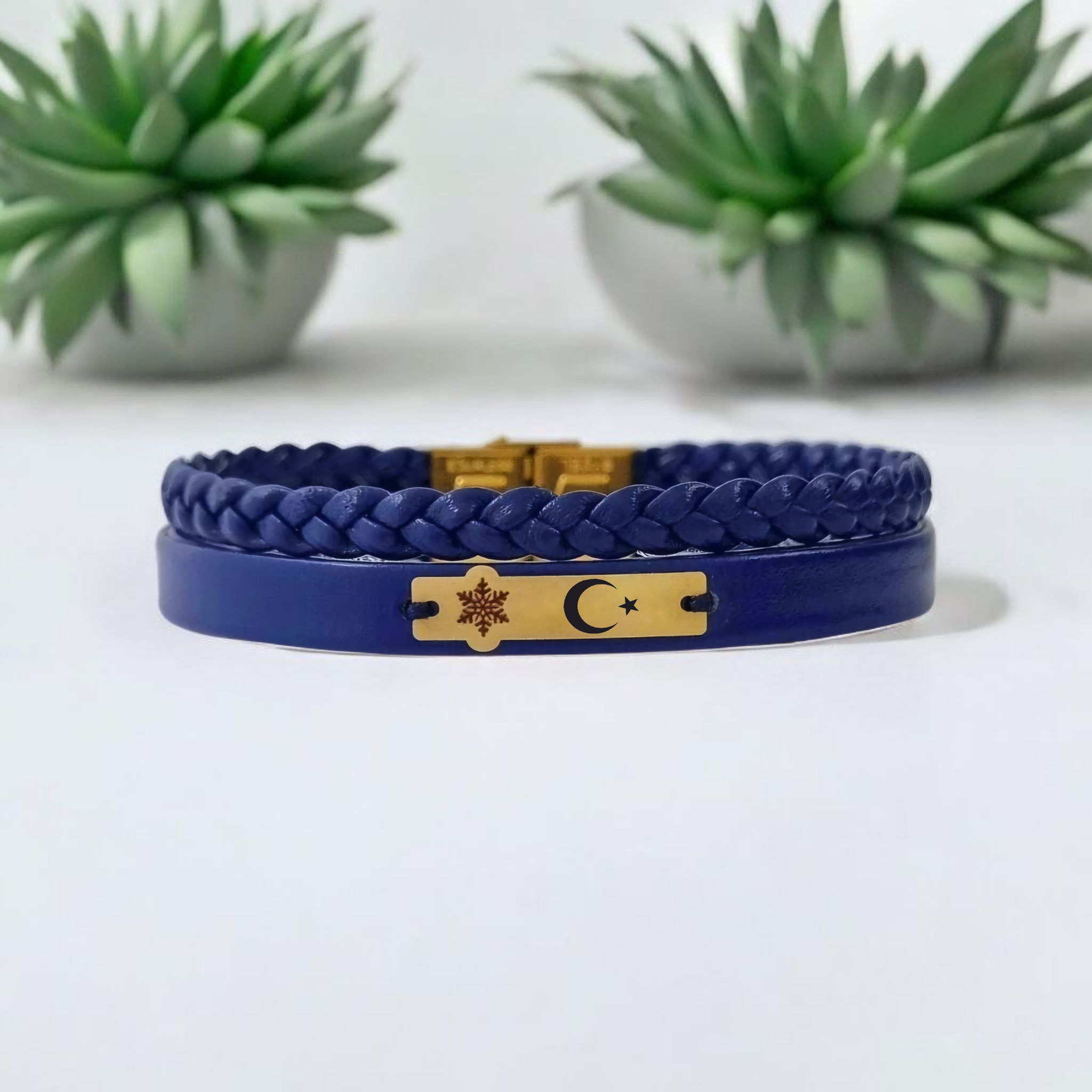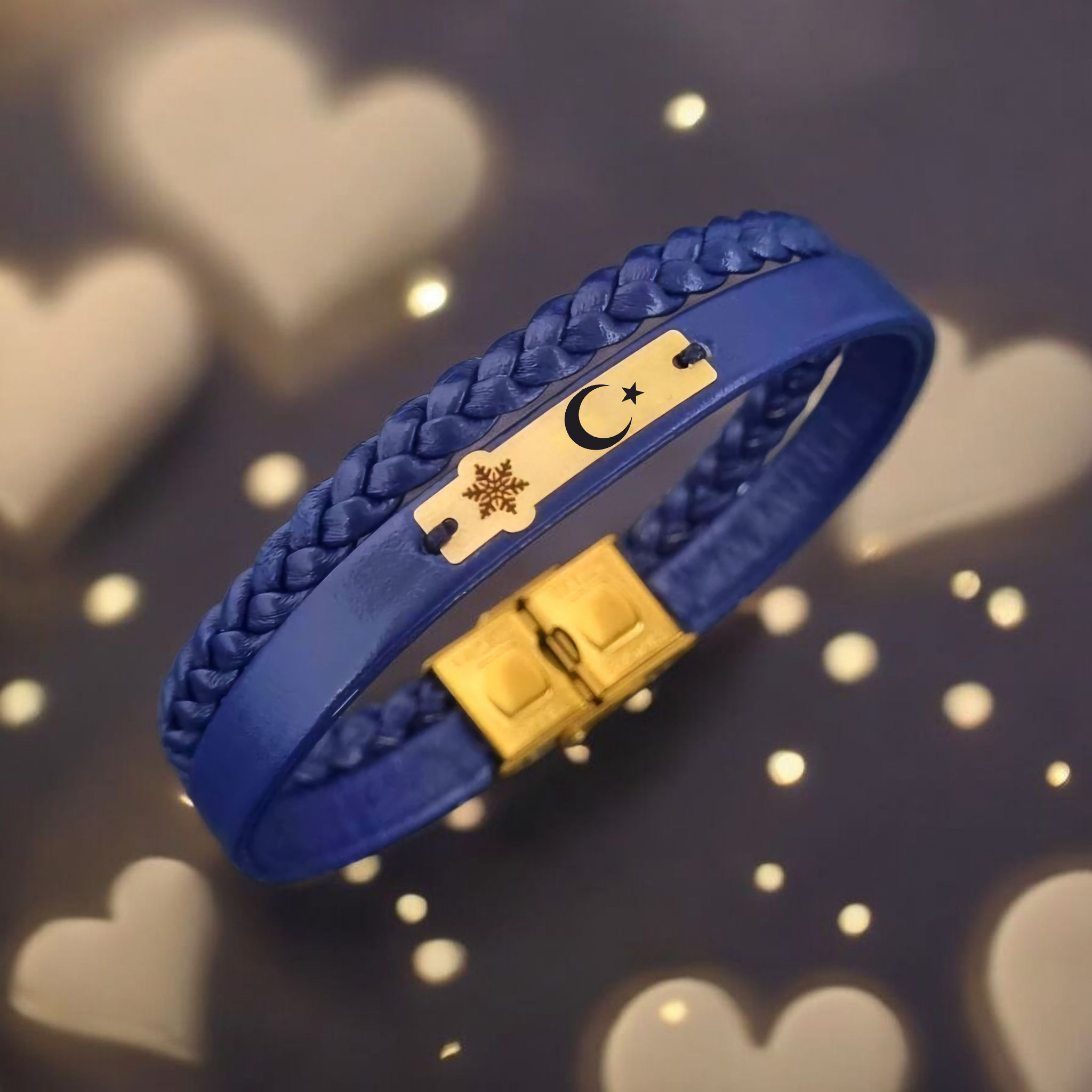 14 Ayar Altın Plakalı Sembole Özel Doğal Lacivert Derili Kar Tanesi Motifli Hediye Bileklik-451