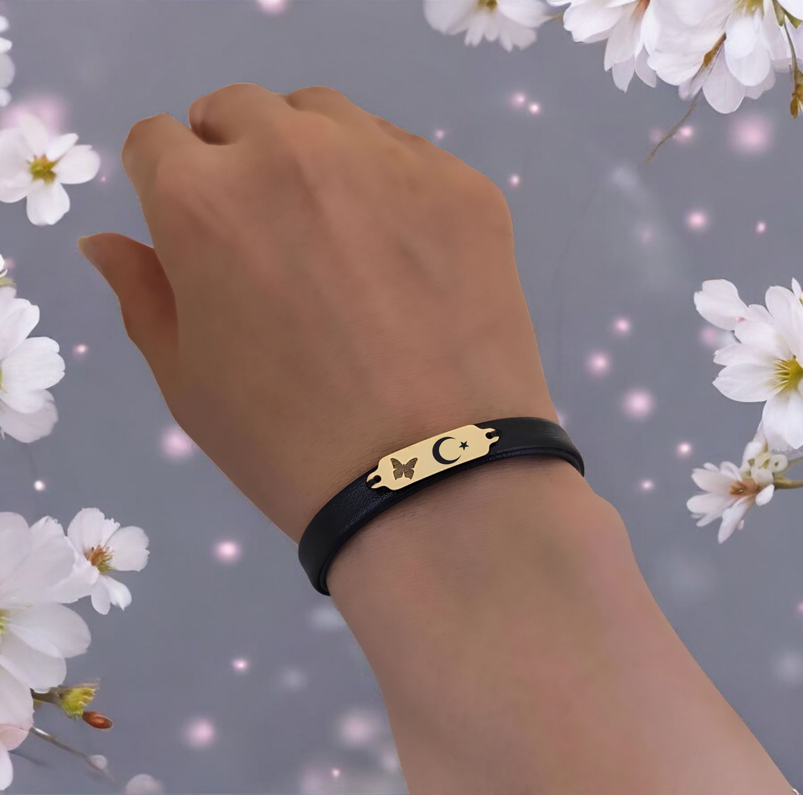 “14 Ayar Altın Plakalı Sembole Özel Doğal Siyah Derili Kelebek Figürlü Hediye Bileklik-646” için yorum yapan ilk kişi siz olun