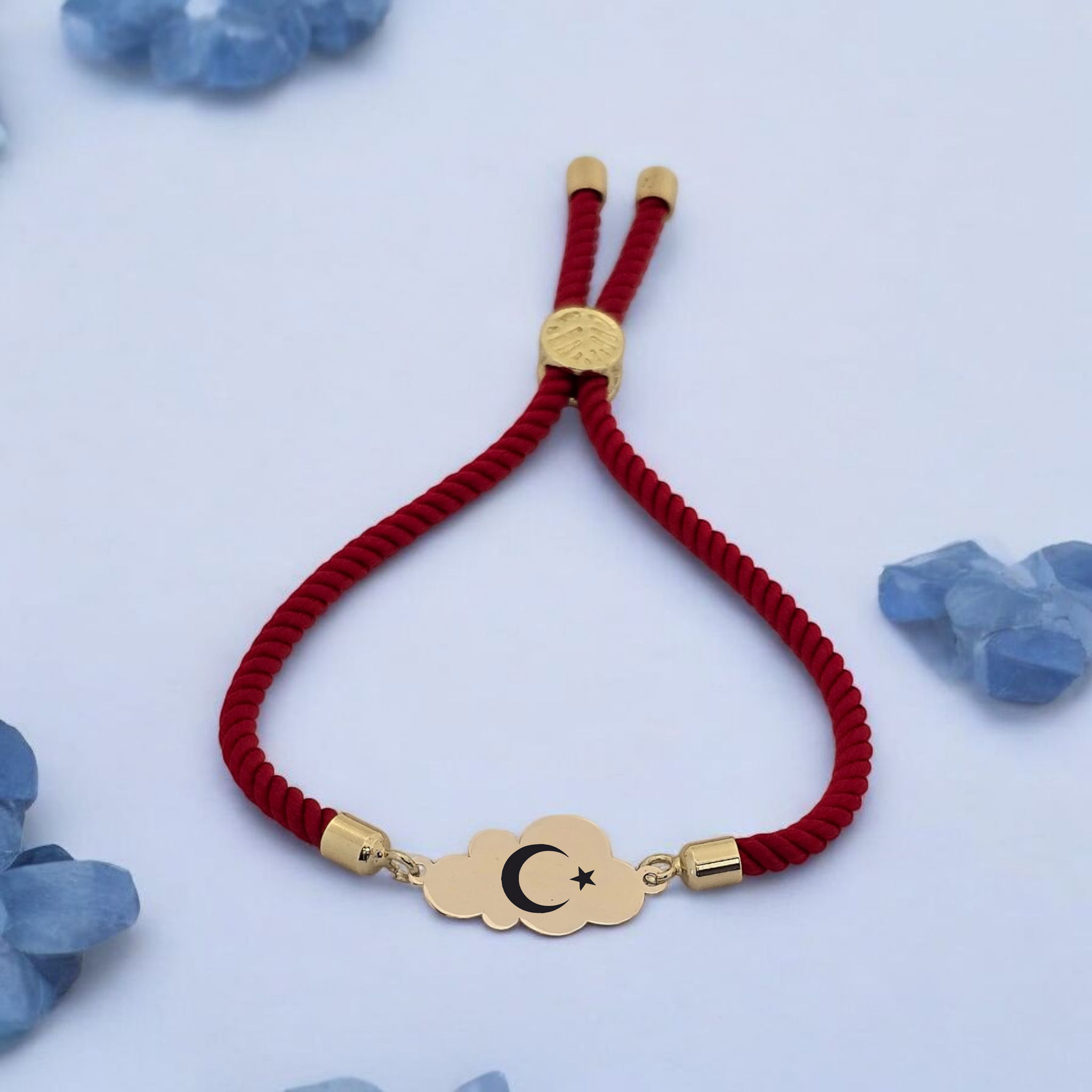 14 Ayar Altın Plakalı Sembole Özel Kırmızı İpek Örgülü Bulut Figürlü Hediye Bileklik-364