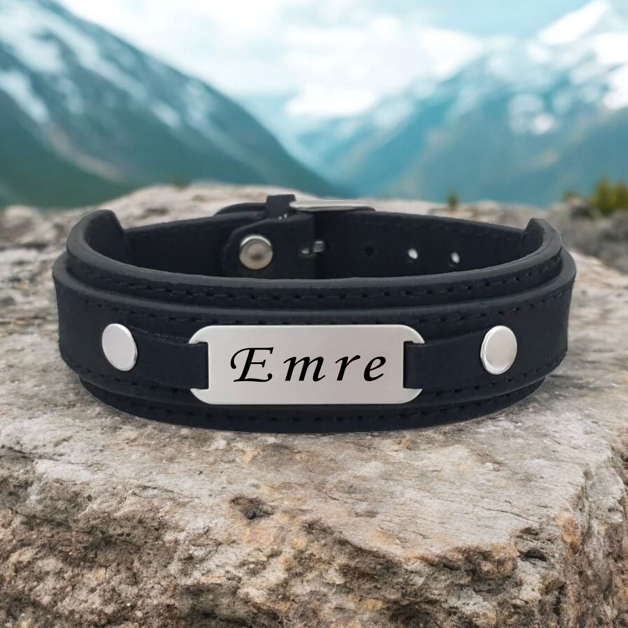 925 Ayar Gümüş Plakalı İsme Özel Hakiki Siyah Derili Oval Figürlü Hediye Bileklik-421