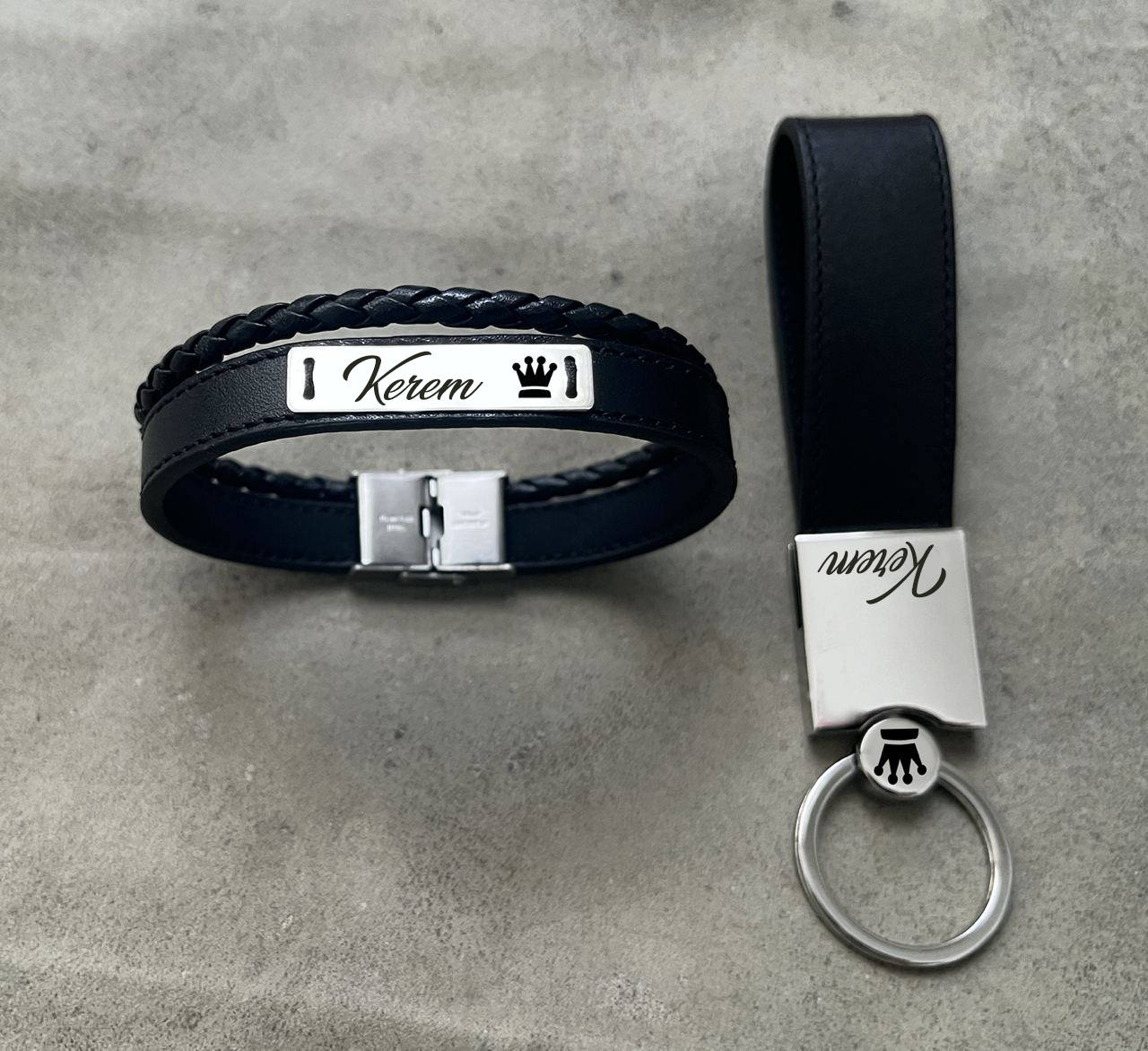 925 Ayar Gümüş Plakalı İsme Özel Taç Motifli Hakiki Siyah Derili Hediye Seti-584